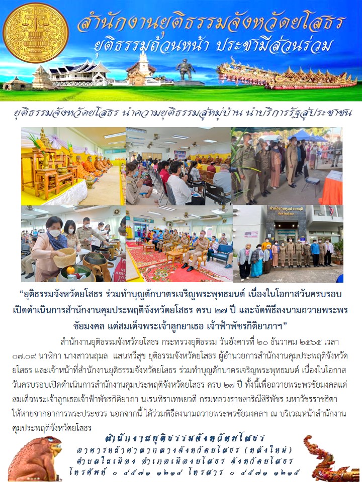 ยุติธรรมจังหวัดยโสธร ร่วมทำบุญตักบาตรเจริญพระพุทธมนต์ เนื่องในโอกาสวันครบรอบเปิดดำเนินการสำนักงานคุมประพฤติจังหวัดยโสธร ครบ ๒๗ ปี และจัดพิธีลงนามถวายพระพรชัยมงคล แด่สมเด็จพระเจ้าลูกยาเธอ เจ้าฟ้าพัชรกิติยาภาฯ