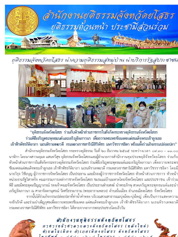 วันที่ 21 ธ.ค. 2565 (10:45 น.)สำนักงานยุติธรรมจังหวัดยโสธร กระทรวงยุติธรรม วันที่ 20 ธันวาคม 2565 ระหว่างเวลา 09.30 - 11.00 นาฬิกา โดยนางสาวนฤมล แสนทวีสุข ยุติธรรมจังหวัดยโสธรและผู้อำนวยการสำนักงานคุมประพฤติจังหวัดยโสธร ร่วมกับหัวหน้าส่วนราชการในสังกัดกระทรวงยุติธรรมจังหวัดยโสธร ร่วมพิธีเจริญพระพุทธมนต์และเจริญจิตภาวนา เพื่อถวายพระพรชัยมงคลแด่สมเด็จพระเจ้าลูกเธอ เจ้าฟ้าพัชรกิติยาภา นเรนทิราเทพยวดี กรมหลวงราชสาริณีสิริพัชร มหาวัชรราชธิดา โดยมีนายวิรุจ วิชัยบุญ ผู้ว่าราชการจังหวัดยโสธร เป็นประธาน และมีรองผู้ว่าราชการจังหวัดยโสธร หัวหน้าส่วนราชการ หัวหน้าหน่วยงานรัฐวิสาหกิจ คณะกรรมการเหล่ากาชาดจังหวัดยโสธร ชมรมแม่บ้านมหาดไทยจังหวัดยโสธร และประชาชน เข้าร่วมพิธี และมีพระอุดมปัญญาภรณ์ รองเจ้าคณะจังหวัดยโสธร เป็นประธานฝ่ายสงฆ์ นำพระภิกษุ สวดเจริญพระพุทธมนต์และนำเจริญจิตภาวนา ณ ศาลาจิตตานุสรณ์ วัดศรีธรรมาราม (พระอารามหลวง) ตำบลในเมือง อำเภอเมืองยโสธร จังหวัดยโสธ จากนั้นได้ร่วมกิจกรรมปล่อยปลาที่ท่าน้ำคำทอง บริเวณสวนสาธารณะบุ่งน้อย-บุ่งใหญ่ เพื่อเป็นการแสดงความจงรักภักดี และร่วมบำเพ็ญกุศลเพื่อถวายพระพรชัยมงคล แด่สมเด็จพระเจ้าลูกเธอ เจ้าฟ้าพัชรกิติยาภา นเรนทิราเทพยวดี กรมหลวงราชสาริณีสิริพัชร มหาวัชรราชธิดา ให้หายจากอาการพระประชวรโดยเร็ววัน