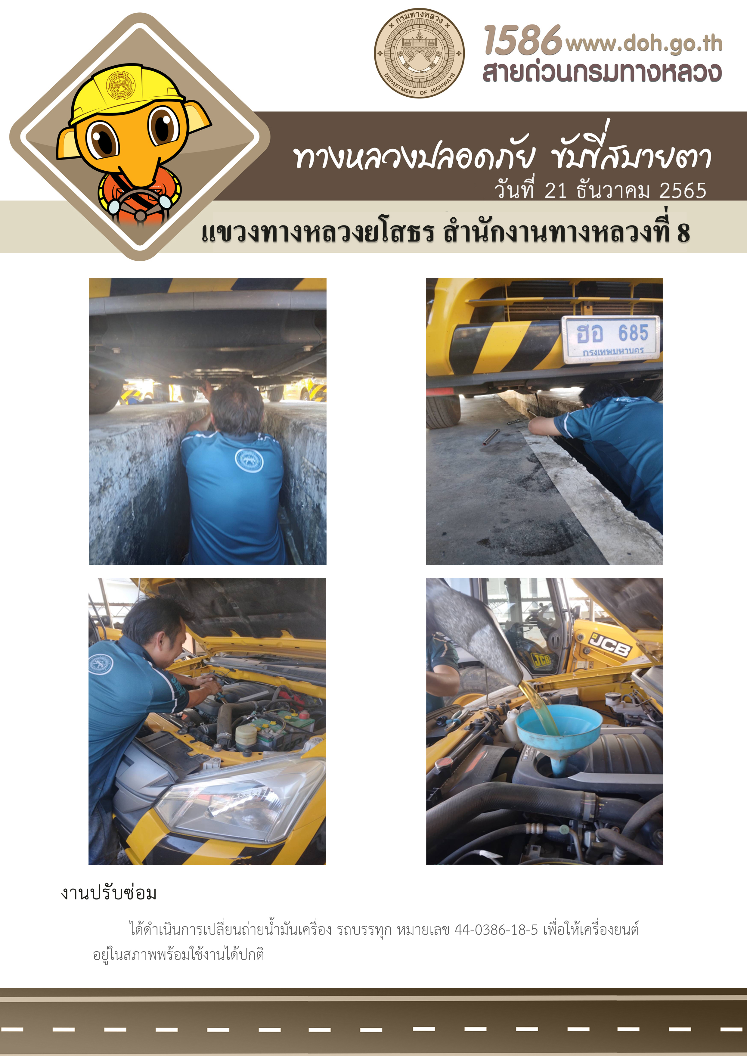 วันที่ 21 ธันวาคม 2565 งานปรับซ่อม ได้ดำเนินการเปลี่ยนถ่ายน้ำมันเครื่อง รถบรรทุก หมายเลข 44-0386-18-5 เพื่อให้เครื่องยนต์ อยู่ในสภาพพร้อมใช้งานได้ปกติ