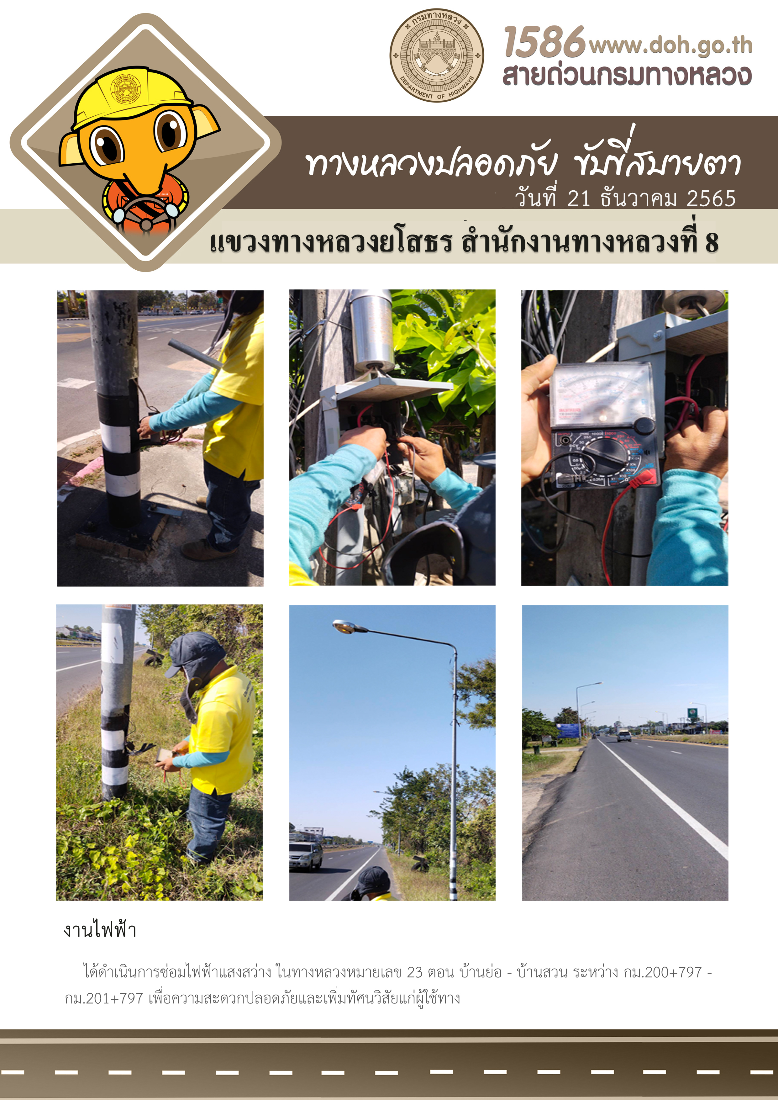 - [15:28] ทั่วไป วันจันทร์ที่ 20 เมษายน 2569 งานไฟฟ้า ได้ดำเนินการซ่อมไฟฟ้าแสงสว่าง ในทางหลวงหมายเลข 292 ตอน ทางเลี่ยงเมืองยโสธร ที่ กม.7+000 เพื่อความสะดวกปลอดภัย และเพิ่มทัศนวิสัยแก่ผู้ใช้ทาง