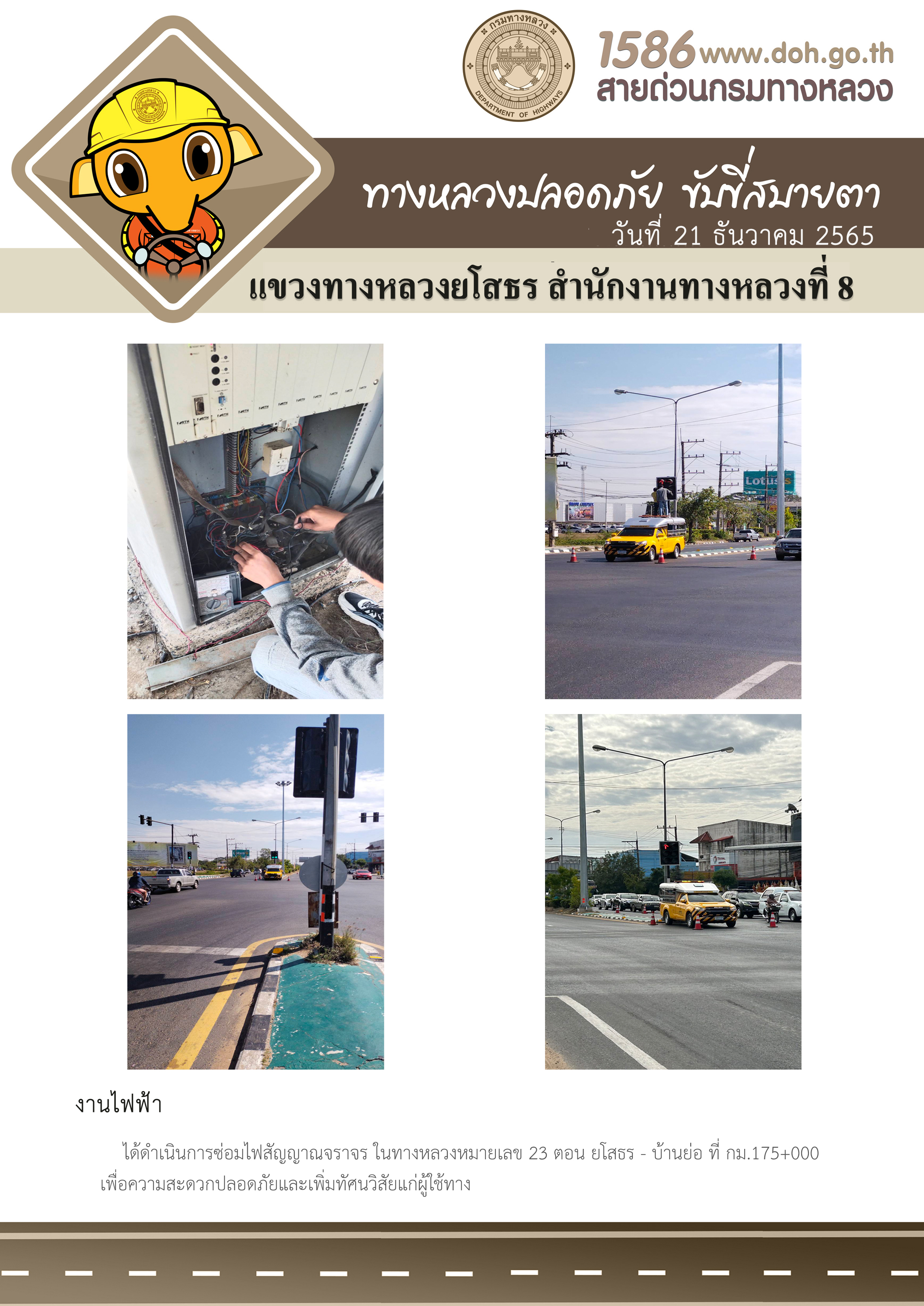 วันที่ 21 ธันวาคม 2565 งานไฟฟ้า ได้ดำเนินการซ่อมไฟสัญญาณจราจร ในทางหลวงหมายเลข 23 ตอน ยโสธร - บ้านย่อ ที่ กม.175+000 เพื่อความสะดวกปลอดภัยและเพิ่มทัศนวิสัยแก่ผู้ใช้ทาง