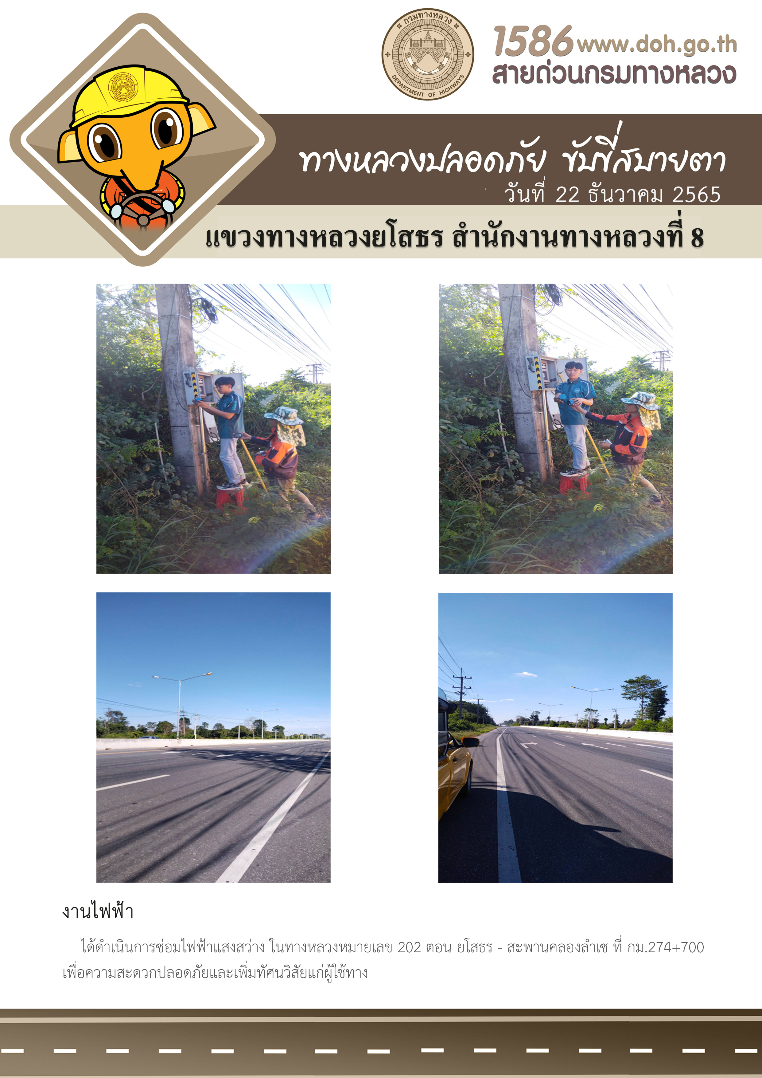 วันที่ 22 ธันวาคม 2565 งานไฟฟ้า ได้ดำเนินการซ่อมไฟฟ้าแสงสว่าง ในทางหลวงหมายเลข 202 ตอน ยโสธร - สะพานคลองลำเซ ที่ กม.274+700 เพื่อความสะดวกปลอดภัยและเพิ่มทัศนวิสัยแก่ผู้ใช้ทาง