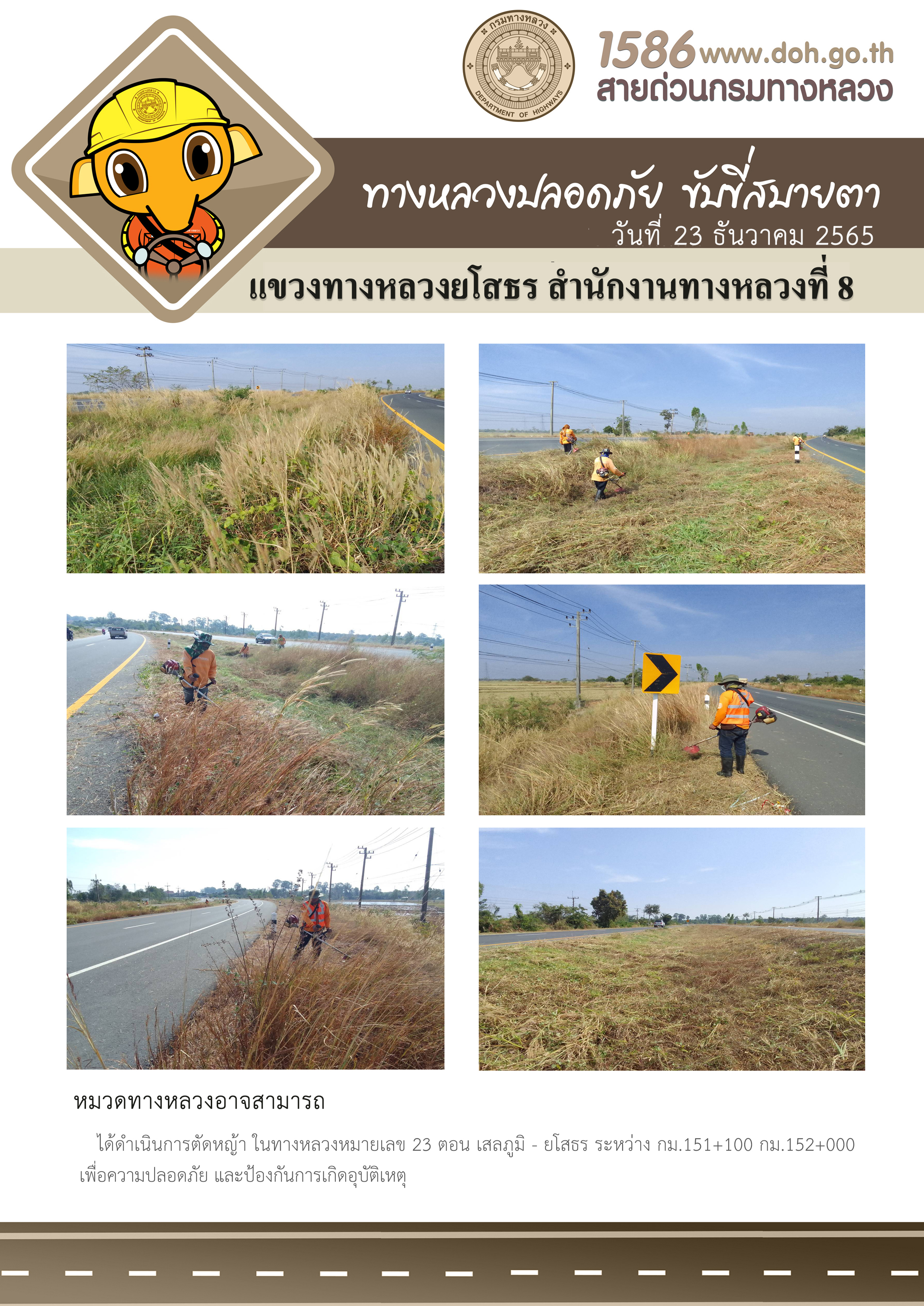 วันที่ 23 ธันวาคม 2565 หมวดทางหลวงอาจสามารถ ได้ดำเนินการตัดหญ้า ในทางหลวงหมายเลข 23 ตอน เสลภูมิ - ยโสธร ระหว่าง กม.151+100 - กม.152+000 เพื่อความปลอดภัย และป้องกันการเกิดอุบัติเหตุ