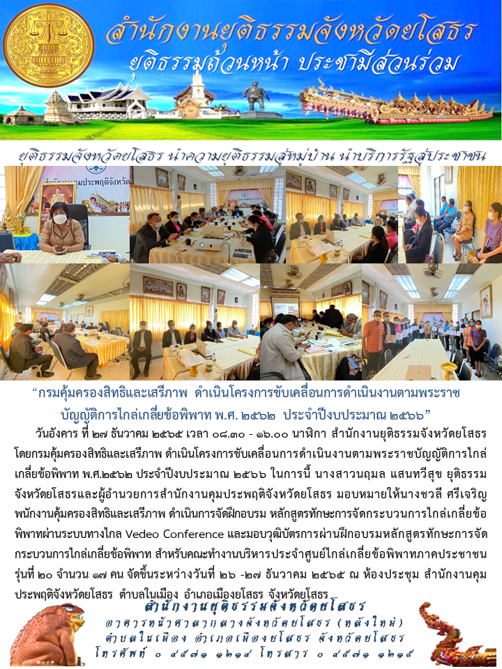 วันที่ 28 ธ.ค. 2565 (14:14 น.)วันอังคาร ที่ 27 ธันวาคม 2565 เวลา 08.30 - 16.00 นาฬิกา สำนักงานยุติธรรมจังหวัดยโสธร โดยกรมคุ้มครองสิทธิและเสรีภาพ ดำเนินโครงการขับเคลื่อนการดำเนินงานตามพระราชบัญญัติการไกล่เกลี่ยข้อพิพาท พ.ศ.2562 ประจำปีงบประมาณ 2566 ในการนี้ นางสาวนฤมล แสนทวีสุข ยุติธรรมจังหวัดยโสธรและผู้อำนวยการสำนักงานคุมประพฤติจังหวัดยโสธร มอบหมายให้นางชวลี ศรีเจริญ พนักงานคุ้มครองสิทธิและเสรีภาพ ดำเนินการจัดฝึกอบรม หลักสูตรทักษะการจัดกระบวนการไกล่เกลี่ยข้อพิพาทผ่านระบบทางไกล Vedeo Conference และมอบวุฒิบัตรการผ่านฝึกอบรมหลักสูตรทักษะการจัดกระบวนการไกล่เกลี่ยข้อพิพาท สำหรับคณะทำงานบริหารประจำศูนย์ไกล่เกลี่ยข้อพิพาทภาคประชาชน รุ่นที่ 20 จำนวน 17 คน จัดขึ้นระหว่างวันที่ 26 -27 ธันวาคม 2565 ณ ห้องประชุม สำนักงานคุมประพฤติจังหวัดยโสธร ตำบลในเมือง อำเภอเมืองยโสธร จังหวัดยโสธร