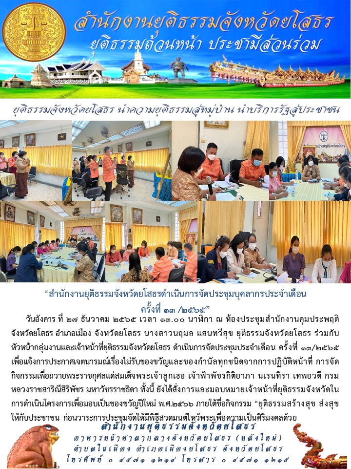 สำนักงานยุติธรรมจังหวัดยโสธรดำเนินการจัดประชุมบุคลากรประจำเดือน ครั้งที่ 13 /2565