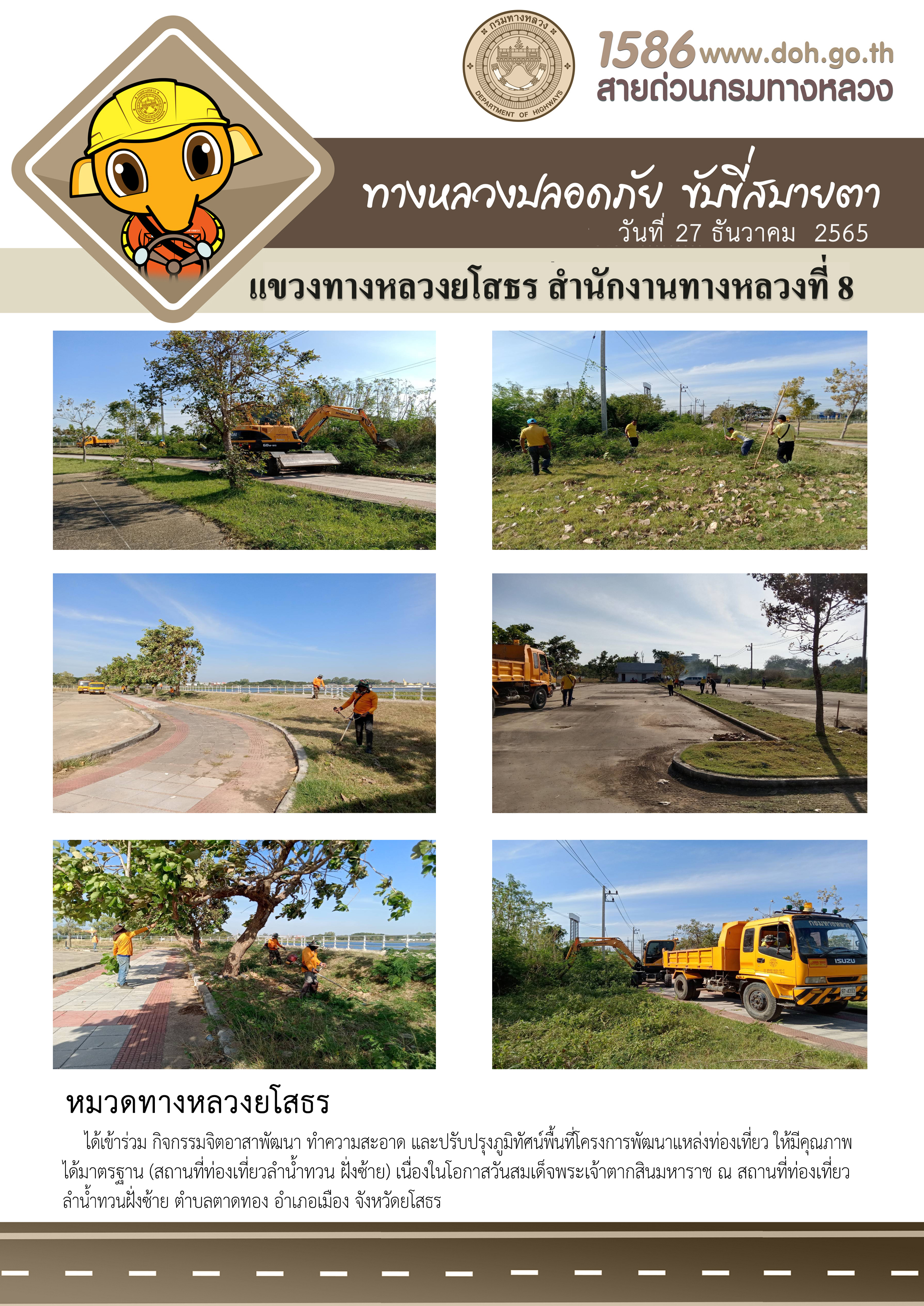- [15:29] ทั่วไป วันจันทร์ที่ 20 เมษายน 2569 งานอำนวยความปลอดภัย ได้ดำเนินการตัดหญ้า, ทำความสะอาดในบริเวณแขวงทางหลวงยโสธร