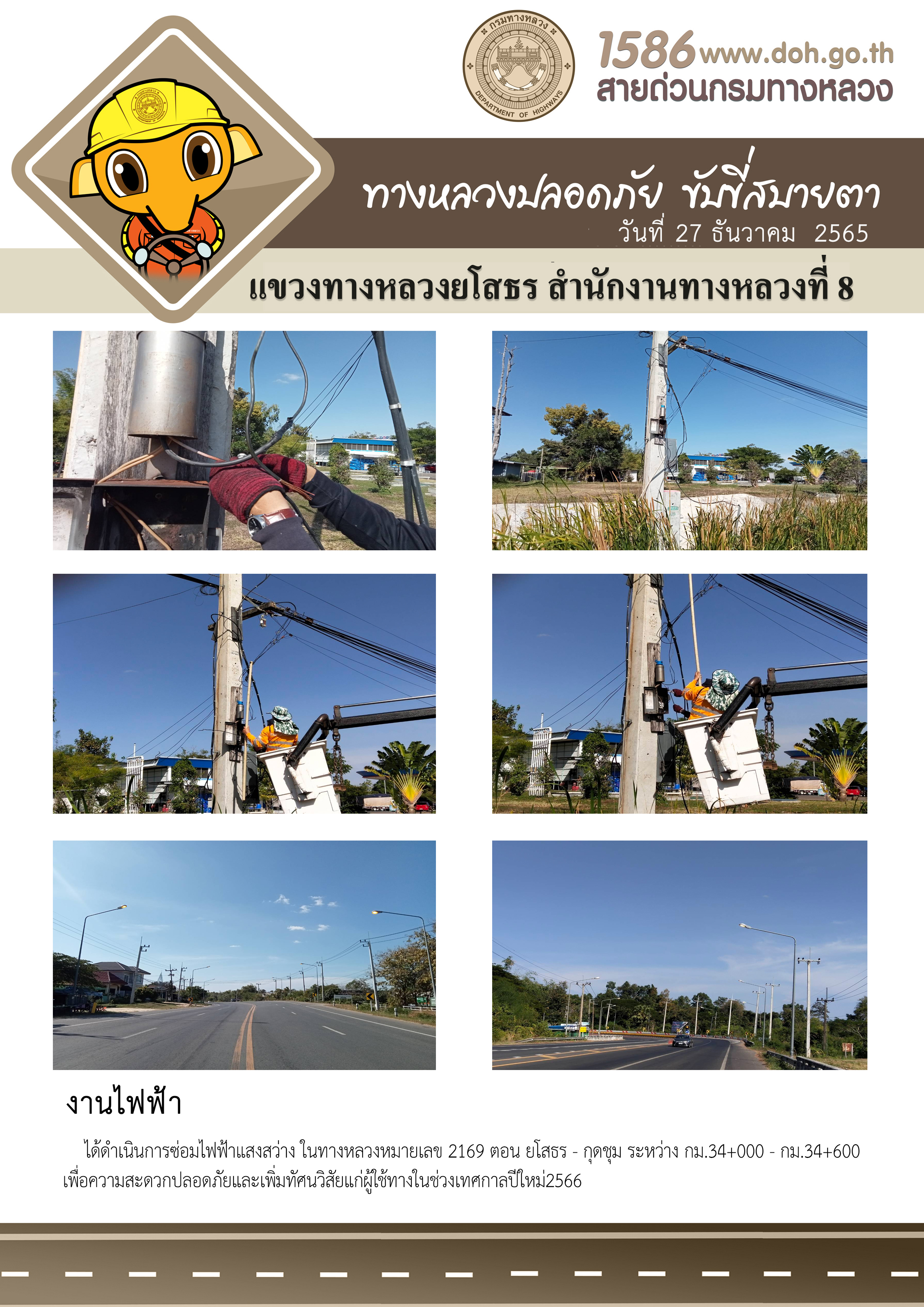 วันที่ 27 ธันวาคม 2565 งานไฟฟ้า ได้ดำเนินการซ่อมไฟฟ้าแสงสว่าง ในทางหลวงหมายเลข 2169 ตอน ยโสธร - กุดชุม ระหว่าง กม.34+000 - กม.34+600 เพื่อความสะดวกปลอดภัยและเพิ่มทัศนวิสัยแก่ผู้ใช้ทางในช่วงเทศกาลปีใหม่2566