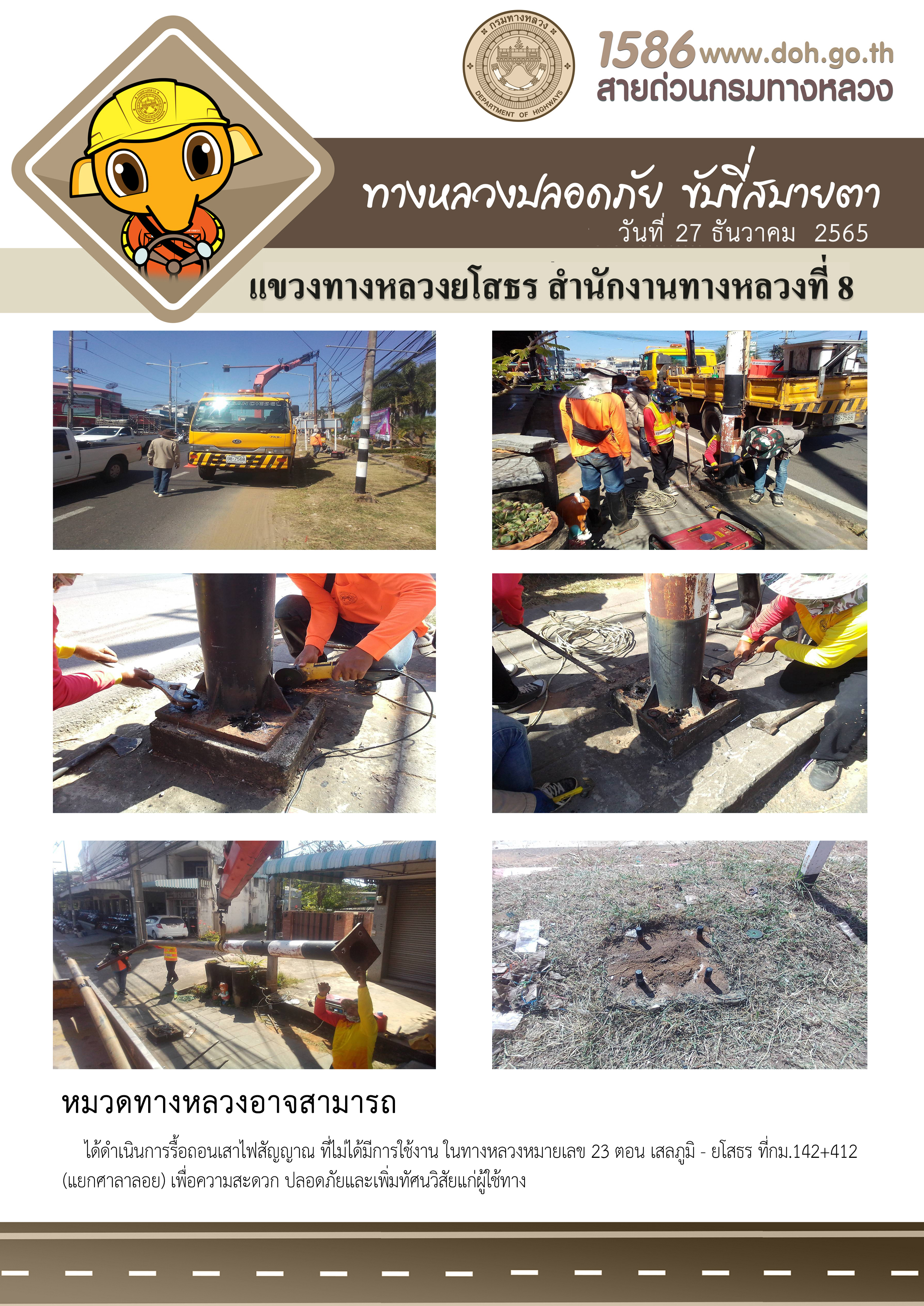 วันที่ 27 ธันวาคม 2565 หมวดทางหลวงอาจสามารถ ได้ดำเนินการรื้อถอนเสาไฟสัญญาณ ที่ไม่ได้มีการใช้งาน ในทางหลวงหมายเลข 23 ตอน เสลภูมิ - ยโสธร ที่กม.142+412 (แยกศาลาลอย) เพื่อความสะดวก ปลอดภัยและเพิ่มทัศนวิสัยแก่ผู้ใช้ทาง
