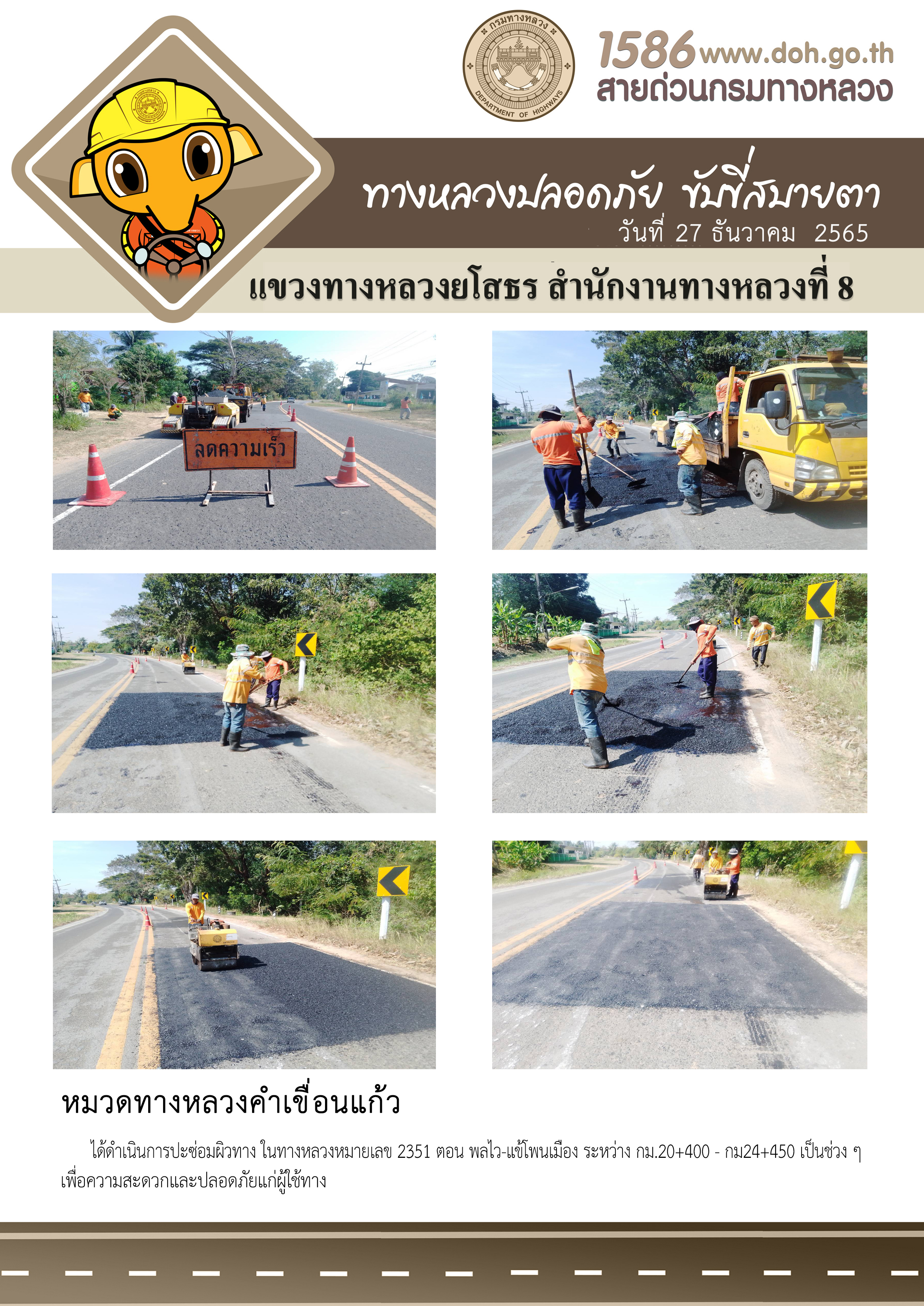 วันที่ 27 ธันวาคม 2565 หมวดทางหลวงคำเขื่อนแก้ว ได้ดำเนินการปะซ่อมผิวทาง ในทางหลวงหมายเลข 2351 ตอน พลไว-แข้โพนเมือง ระหว่าง กม.20+400 - กม.24+450 เป็นช่วง ๆ เพื่อความสะดวกและปลอดภัยแก่ผู้ใช้ทาง
