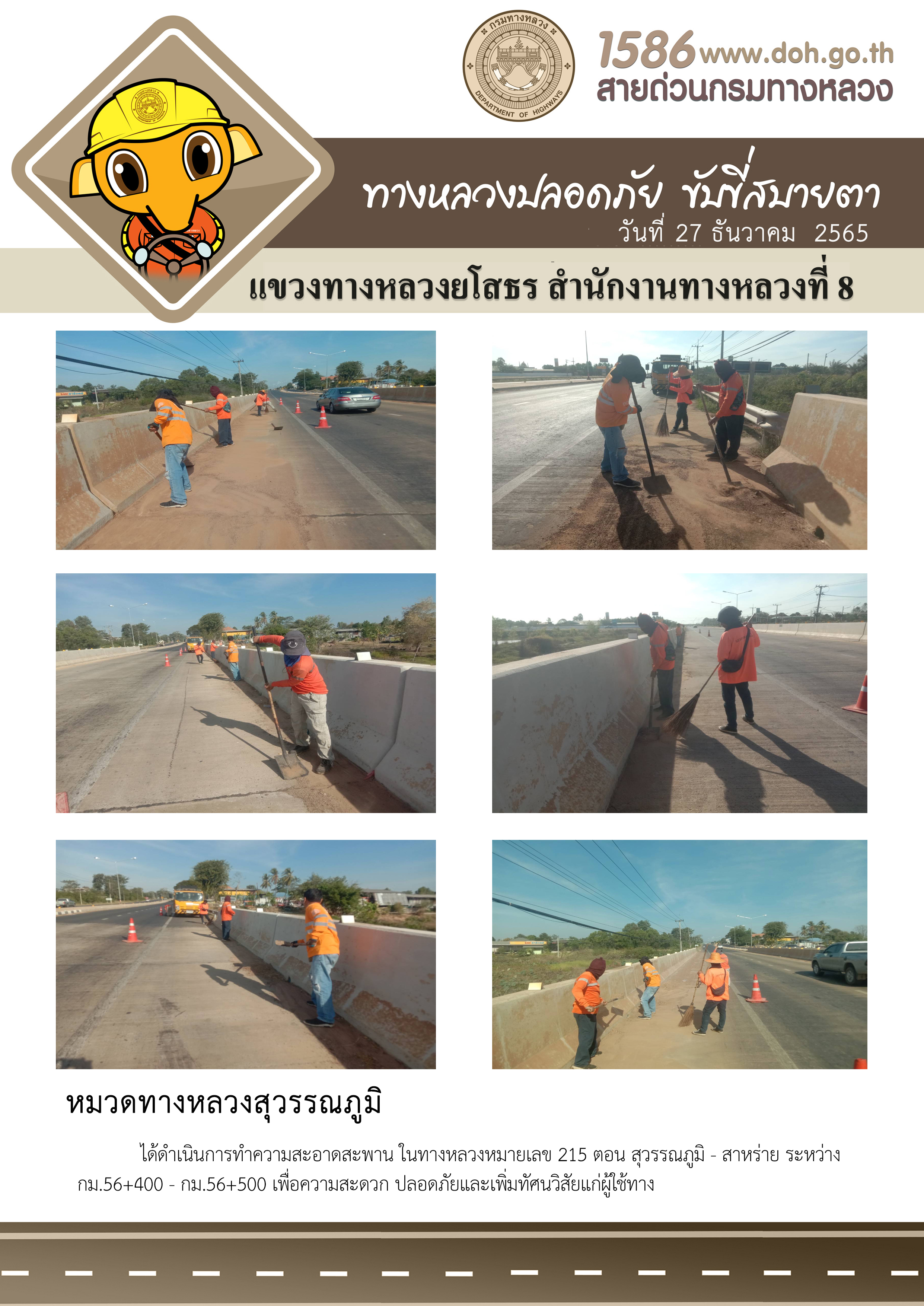วันที่ 27 ธันวาคม 2565 หมวดทางหลวงสุวรรณภูมิ ได้ดำเนินการทำความสะอาดสะพาน ในทางหลวงหมายเลข 215 ตอน สุวรรณภูมิ - สาหร่าย ระหว่าง กม.56+400 - กม.56+500 เพื่อความสะดวก ปลอดภัยและเพิ่มทัศนวิสัยแก่ผู้ใช้ทาง