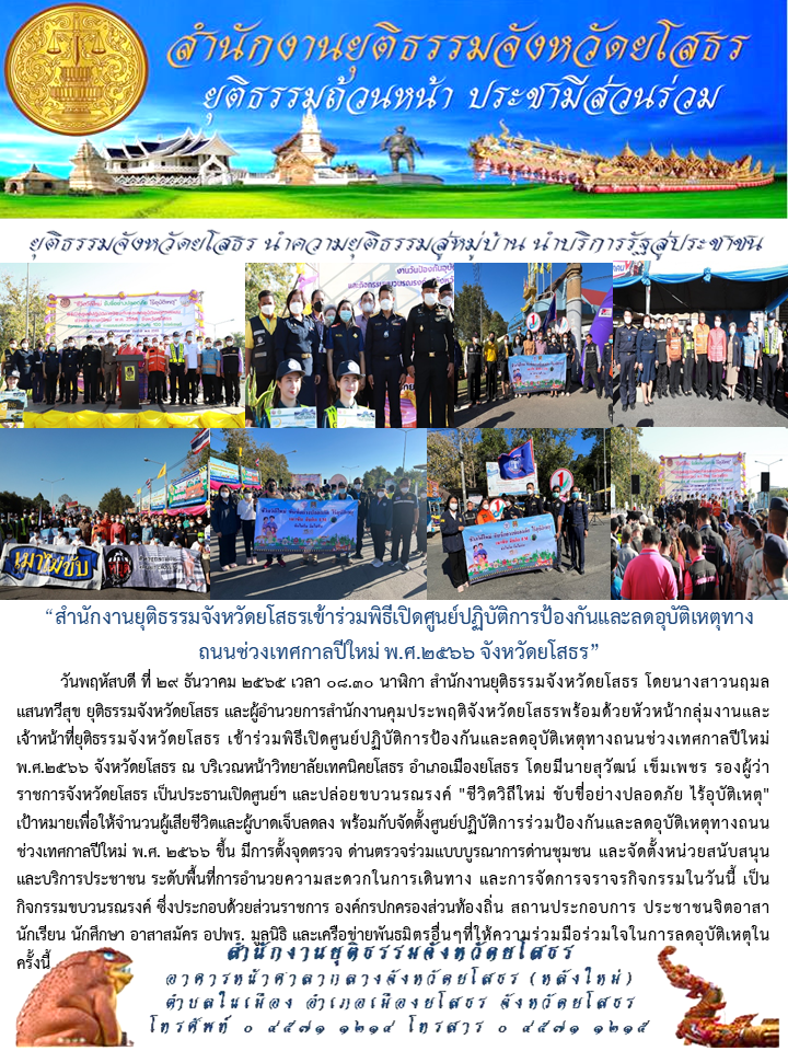วันที่ 29 ธ.ค. 2565 (12:21 น.)วันพฤหัสบดี ที่ 29 ธันวาคม 2565 เวลา 08.30 นาฬิกา สำนักงานยุติธรรมจังหวัดยโสธร โดยนางสาวนฤมล แสนทวีสุข ยุติธรรมจังหวัดยโสธร และผู้อำนวยการสำนักงานคุมประพฤติจังหวัดยโสธรพร้อมด้วยหัวหน้ากลุ่มงานและเจ้าหน้าที่ยุติธรรมจังหวัดยโสธร เข้าร่วมพิธีเปิดศูนย์ปฏิบัติการป้องกันและลดอุบัติเหตุทางถนนช่วงเทศกาลปีใหม่ พ.ศ.2566 จังหวัดยโสธร ณ บริเวณหน้าวิทยาลัยเทคนิคยโสธร อำเภอเมืองยโสธร โดยมีนายสุวัฒน์ เข็มเพชร รองผู้ว่าราชการจังหวัดยโสธร เป็นประธานเปิดศูนย์ฯ และปล่อยขบวนรณรงค์ "ชีวิตวิถีใหม่ ขับขี่อย่างปลอดภัย ไร้อุบัติเหตุ" เป้าหมายเพื่อให้จำนวนผู้เสียชีวิตและผู้บาดเจ็บลดลง พร้อมกับจัดตั้งศูนย์ปฏิบัติการร่วมป้องกันและลดอุบัติเหตุทางถนนช่วงเทศกาลปีใหม่ พ.ศ. 2566 ขึ้น มีการตั้งจุดตรวจ ด่านตรวจร่วมแบบบูรณาการด่านชุมชน และจัดตั้งหน่วยสนับสนุนและบริการประชาชน ระดับพื้นที่การอำนวยความสะดวกในการเดินทาง และการจัดการจราจรกิจกรรมในวันนี้ เป็นกิจกรรมขบวนรณรงค์ ซึ่งประกอบด้วยส่วนราชการ องค์กรปกครองส่วนท้องถิ่น สถานประกอบการ ประชาชนจิตอาสา นักเรียน นักศึกษา อาสาสมัคร อปพร. มูลนิธิ และเครือข่ายพันธมิตรอื่นๆที่ให้ความร่วมมือร่วมใจในการลดอุบัติเหตุในครั้งนี้