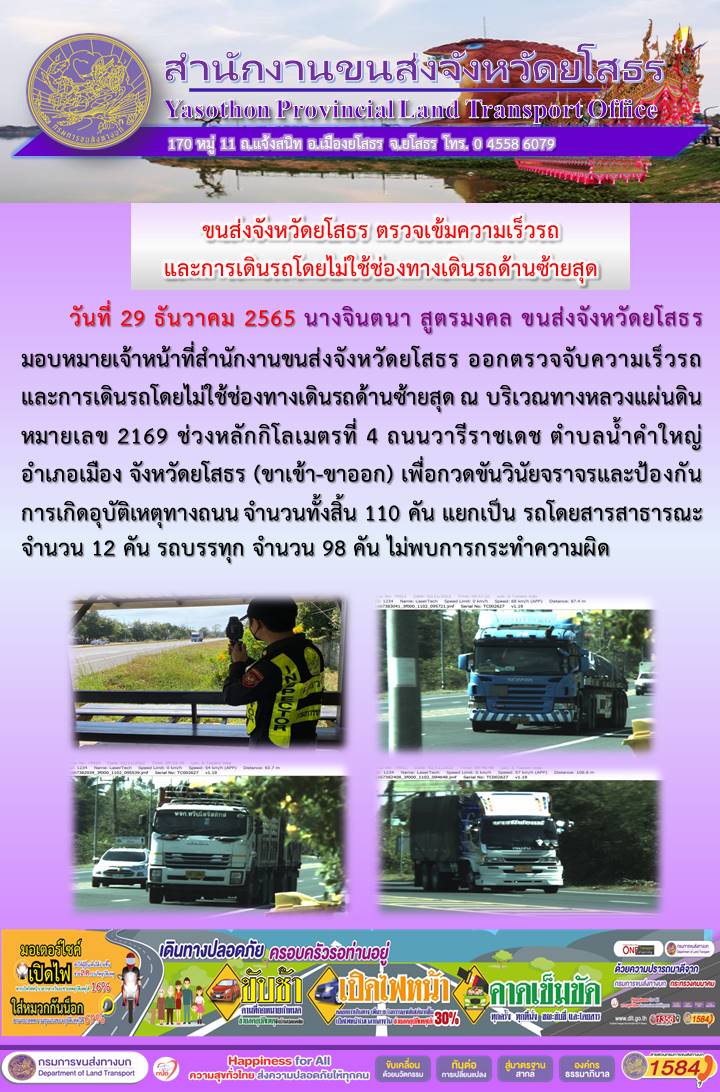 วันที่ 29 ธันวาคม 2565 เจ้าหน้าที่สำนักงานขนส่งจังหวัดยโสธร ออกตั้งจุดตรวจจับความเร็ว