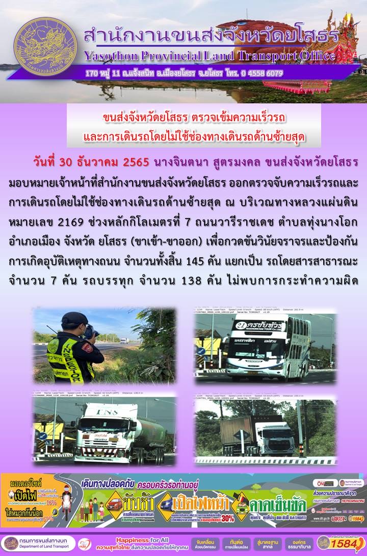 วันที่ 30 ธันวาคม 2565 เจ้าหน้าที่สำนักงานขนส่งจังหวัดยโสธร ออกตั้งจุดตรวจจับความเร็ว