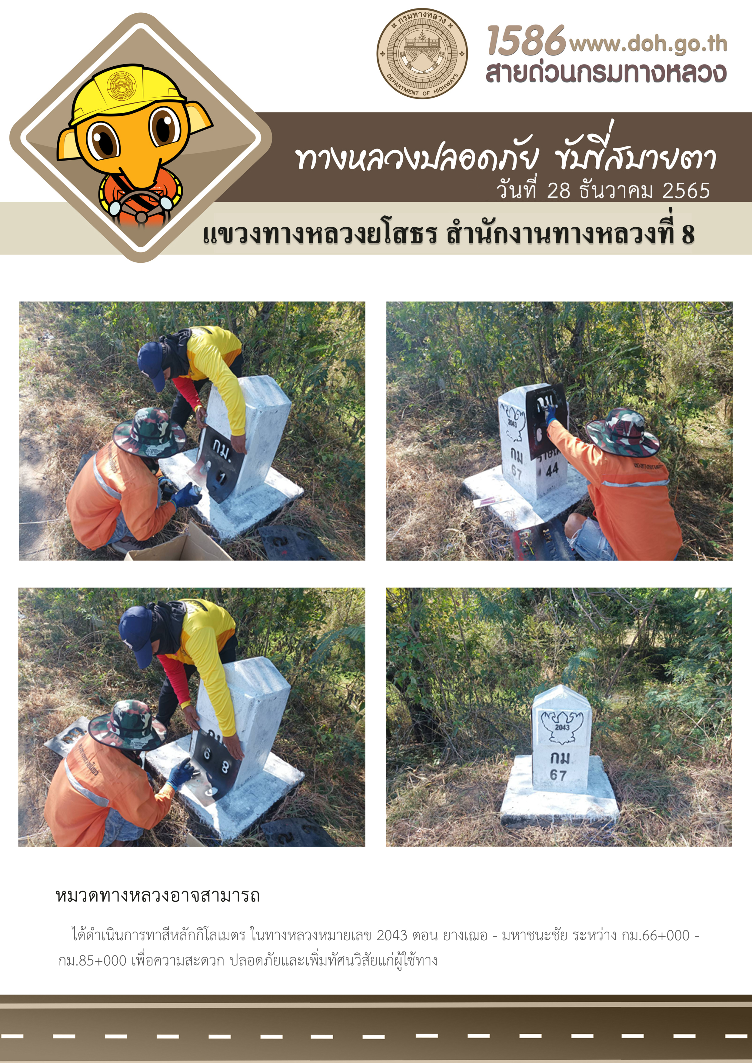 วันที่ 28 ธันวาคม 2565 หมวดทางหลวงอาจสามารถ ได้ดำเนินการทาสีหลักกิโลเมตร ในทางหลวงหมายเลข 2043 ตอน ยางเฌอ - มหาชนะชัย ระหว่าง กม.66+000 - กม.85+000 เพื่อความสะดวก ปลอดภัยและเพิ่มทัศนวิสัยแก่ผู้ใช้ทาง