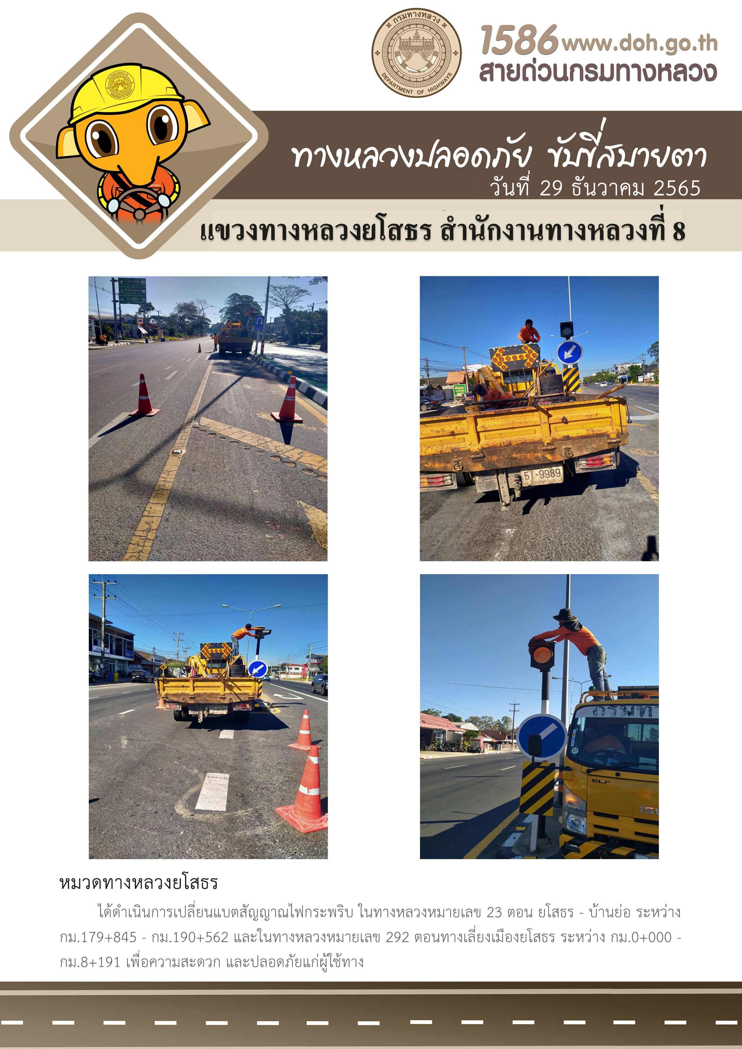 วันที่ 29 ธันวาคม 2565 หมวดทางหลวงยโสธร ได้ดำเนินการเปลี่ยนแบตสัญญาณไฟกระพริบ ในทล.หมายเลข 23 ตอนยโสธร-บ้านย่อ ระหว่าง กม.179+845-กม.190+562 และในทล.หมายเลข 292 ตอนทางเลี่ยงเมืองยโสธร ระหว่าง กม.0+000-กม.8+191 เพื่อความสะดวกปลอดภัยแก่ผู้ใช้ทาง