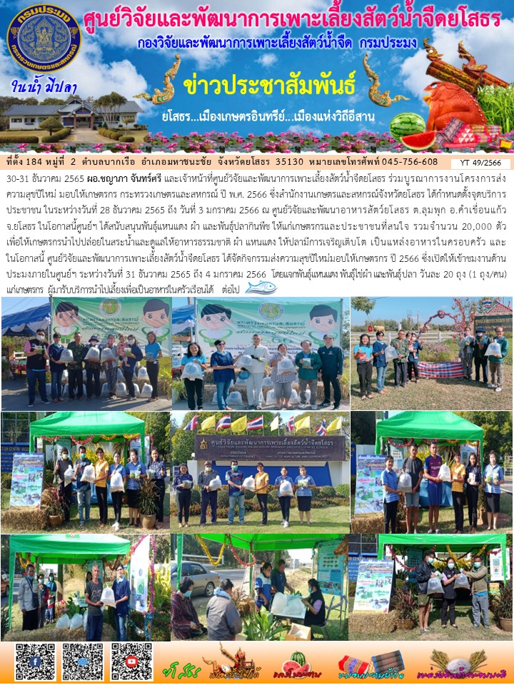 ผอ.ชญาภา จันทร์ศรี และเจ้าหน้าที่ศพจ.ยโสธร ร่วมบูรณาการโครงการส่งความสุขปีใหม่มอบให้เกษตรกร กระทรวงเกษตรฯ ปี 2566 และได้จัดกิจกรรมส่งความสุขปีใหม่มอบให้เกษตรกร ปี 2566 ซึ่งเปิดให้เข้าชมงานด้านประมงภายในศูนย์ฯ ระหว่าง 31 ธ.ค. 2565 ถึง 4 ม.ค. 2566