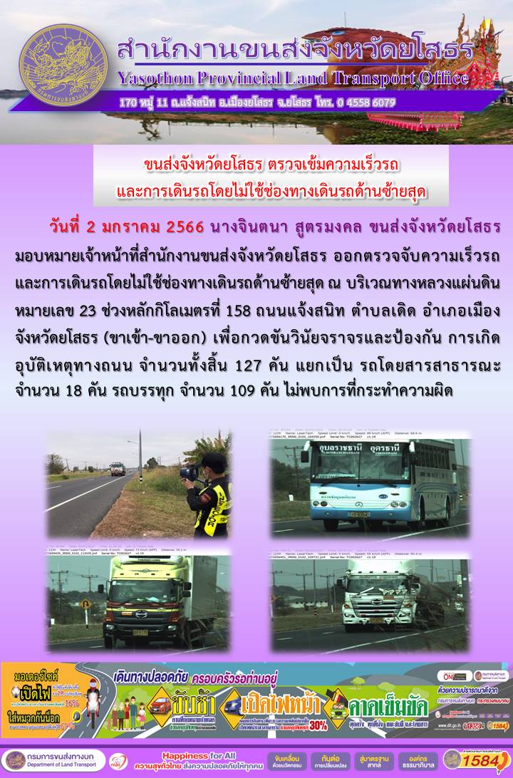วันที่ 2 มกราคม 2566 เจ้าหน้าที่สำนักงานขนส่งจังหวัดยโสธร ออกตั้งจุดตรวจจับความเร็ว