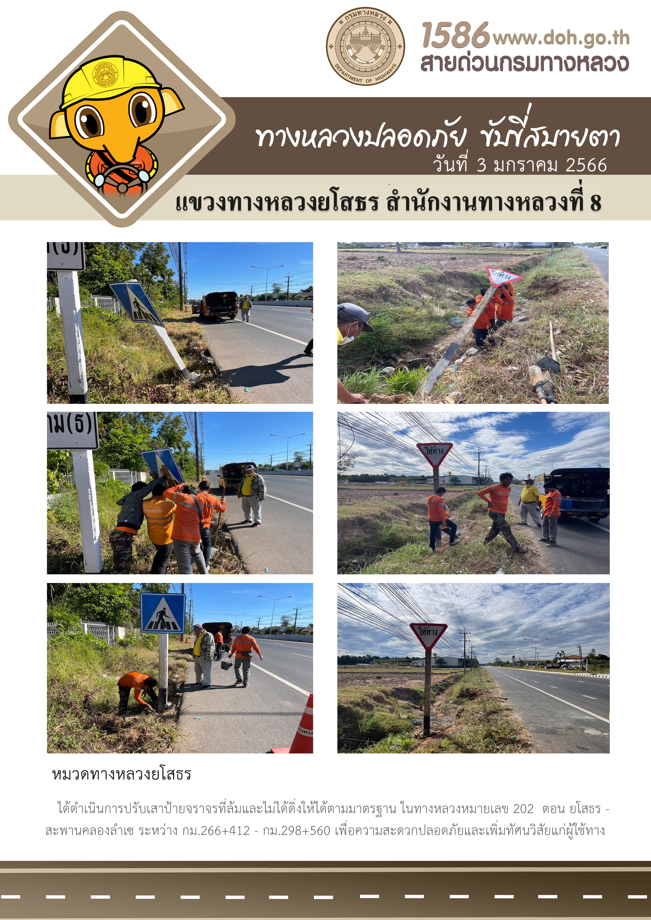 วันที่ 3 มกราคม 2566 หมวดทางหลวงยโสธร ได้ดำเนินการปรับเสาป้ายจราจรที่ล้มและไม่ได้ดิ่งให้ได้ตามมาตรฐาน ในทางหลวงหมายเลข 202 ตอน ยโสธร - สะพานคลองลำเซ ระหว่าง กม.266+412 - กม.298+560 เพื่อความสะดวกปลอดภัยและเพิ่มทัศนวิสัยแก่ผู้ใช้ทาง