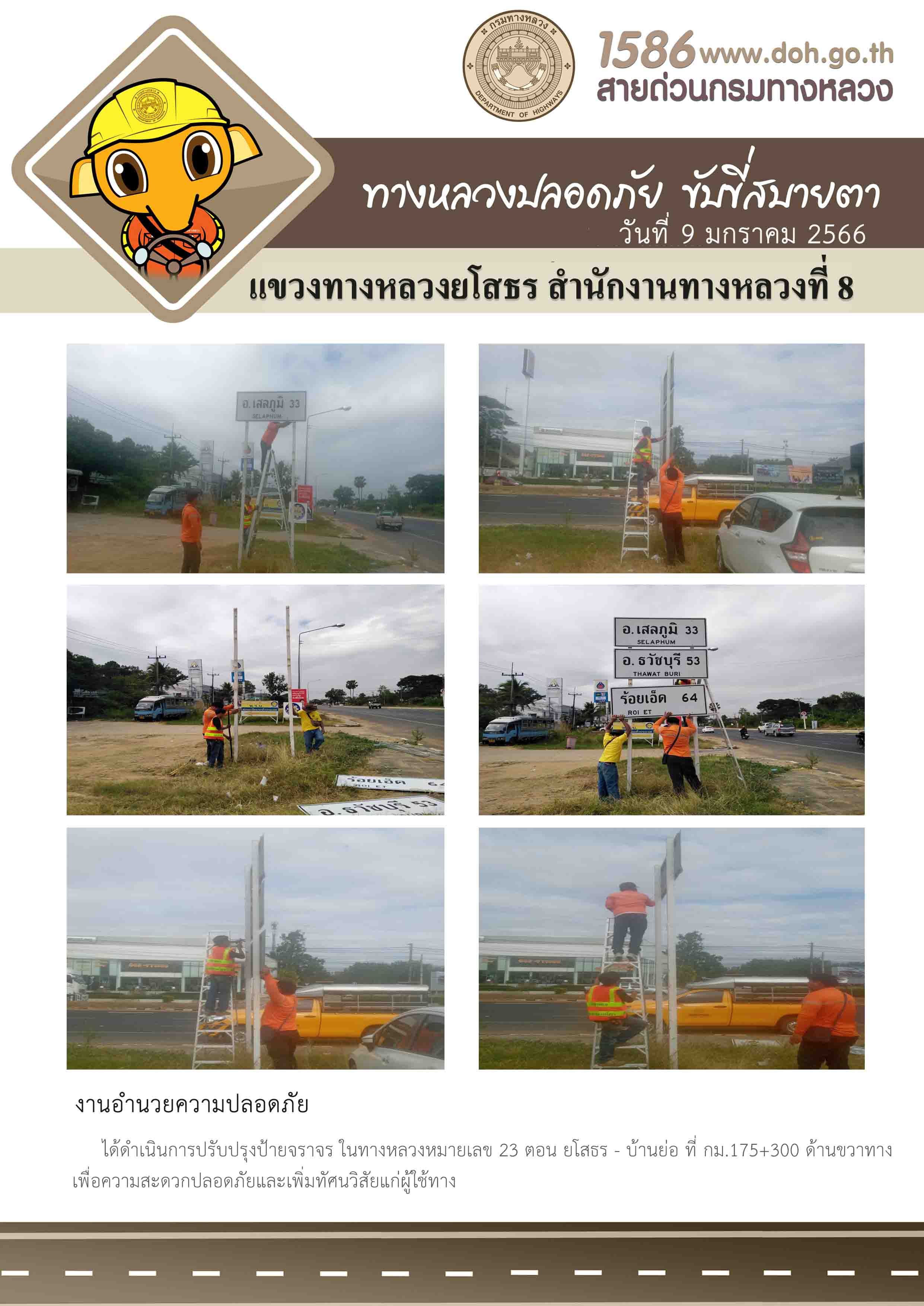 วันที่ 9 มกราคม 2566 งานอำนวยความปลอดภัย ได้ดำเนินการปรับปรุงป้ายจราจร ในทางหลวงหมายเลข 23 ตอน ยโสธร - บ้านย่อ ที่ กม.175+300 ด้านขวาทาง เพื่อความสะดวกปลอดภัยและเพิ่มทัศนวิสัยแก่ผู้ใช้ทาง