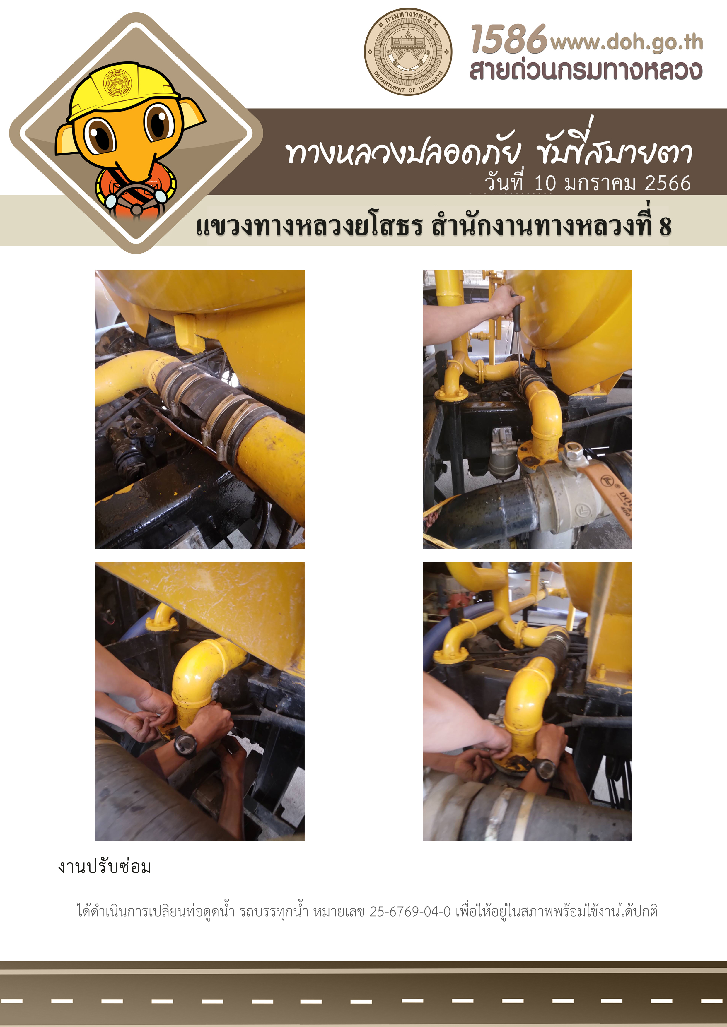 วันที่ 10 มกราคม 2566 งานปรับซ่อม ได้ดำเนินการเปลี่ยนท่อดูดน้ำ รถบรรทุกน้ำ หมายเลข 25-6769-04-0 เพื่อให้อยู่ในสภาพพร้อมใช้งานได้ปกติ