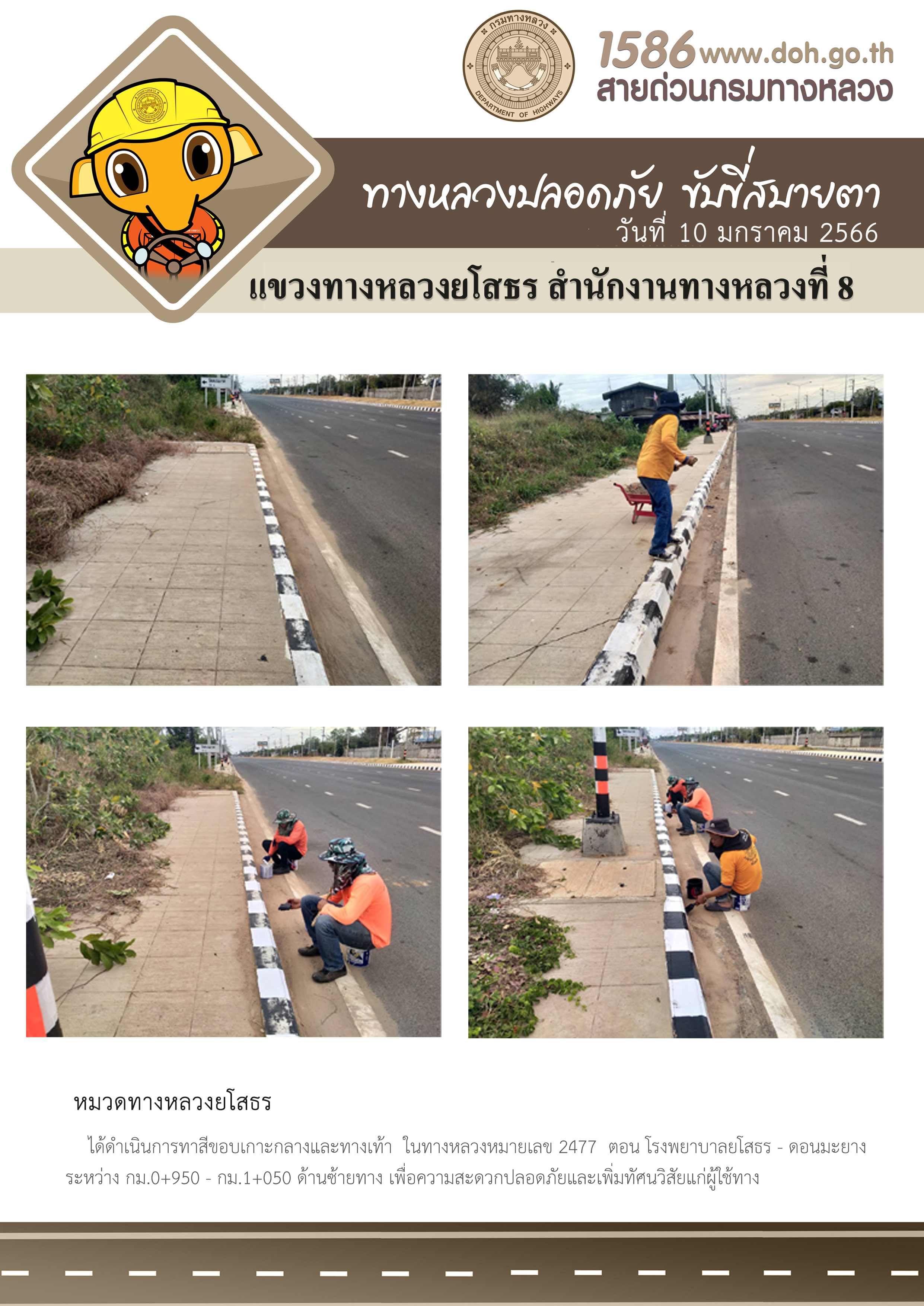 วันที่ 10 มกราคม 2566 หมวดทางหลวงยโสธร ได้ดำเนินการทาสีขอบเกาะกลางและทางเท้า ในทางหลวงหมายเลข 2477 ตอน โรงพยาบาลยโสธร - ดอนมะยาง ระหว่าง กม.0+950 - กม.1+050 ด้านซ้ายทาง เพื่อความสะดวกปลอดภัยและเพิ่มทัศนวิสัยแก่ผู้ใช้ทาง