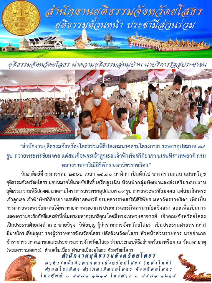 สำนักงานยุติธรรมจังหวัดยโสธรร่วมพิธีปลงผมนาคตามโครงการบรรพชาอุปสมบท ๙๙ รูป ถวายพระพรชัยมงคล แด่สมเด็จพระเจ้าลูกเธอ เจ้าฟ้าพัชรกิติยาภา นเรนทิราเทพยวดี กรมหลวงราชสาริณีสิริพัชร มหาวัชรราชธิดา