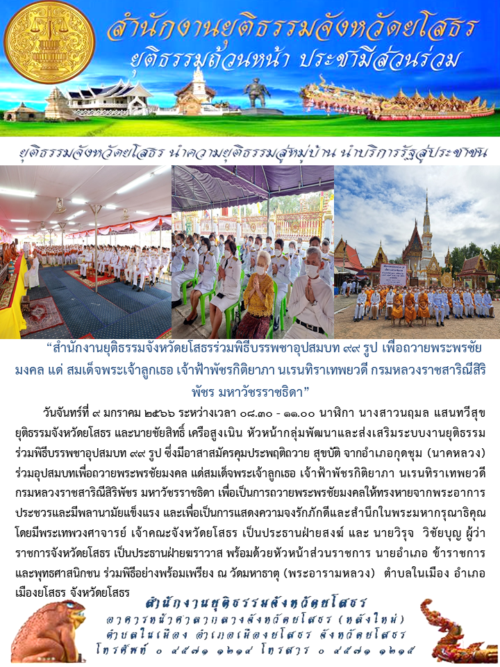 สำนักงานยุติธรรมจังหวัดยโสธรร่วมพิธีบรรพชาอุปสมบท ๙๙ รูป เพื่อถวายพระพรชัยมงคล แด่ สมเด็จพระเจ้าลูกเธอ เจ้าฟ้าพัชรกิติยาภา นเรนทิราเทพยวดี กรมหลวงราชสาริณีสิริพัชร มหาวัชรราชธิดา