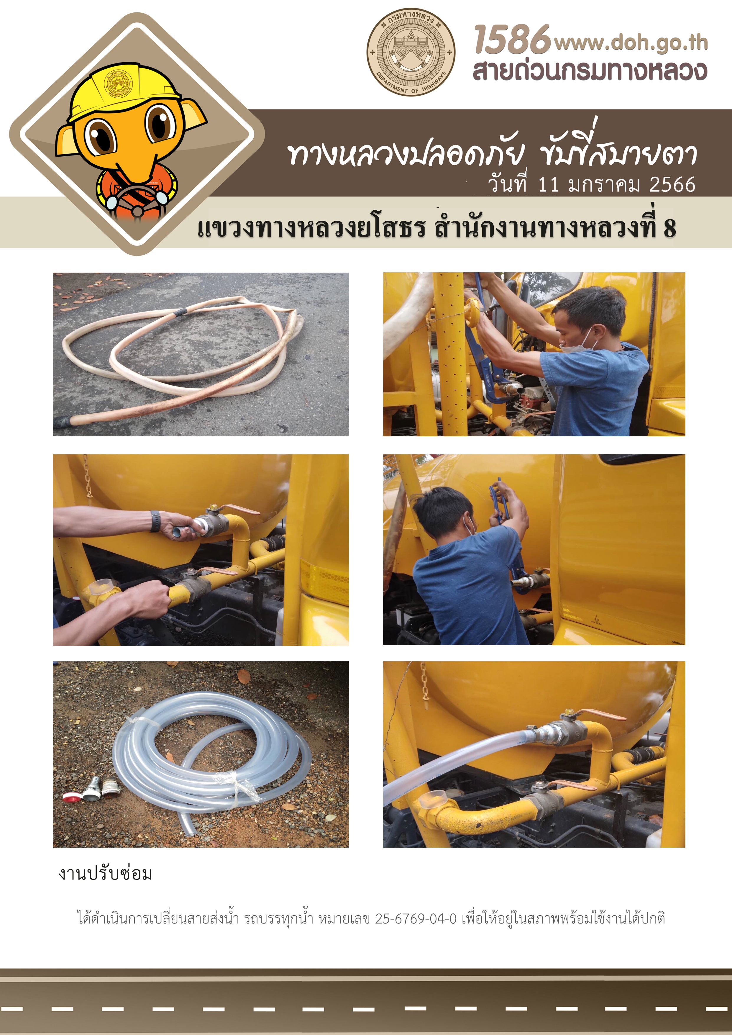 วันที่ 11 มกราคม 2566 งานปรับซ่อม ได้ดำเนินการเปลี่ยนสายส่งน้ำ รถบรรทุกน้ำ หมายเลข 25-6769-04-0 เพื่อให้อยู่ในสภาพพร้อมใช้งานได้ปกติ
