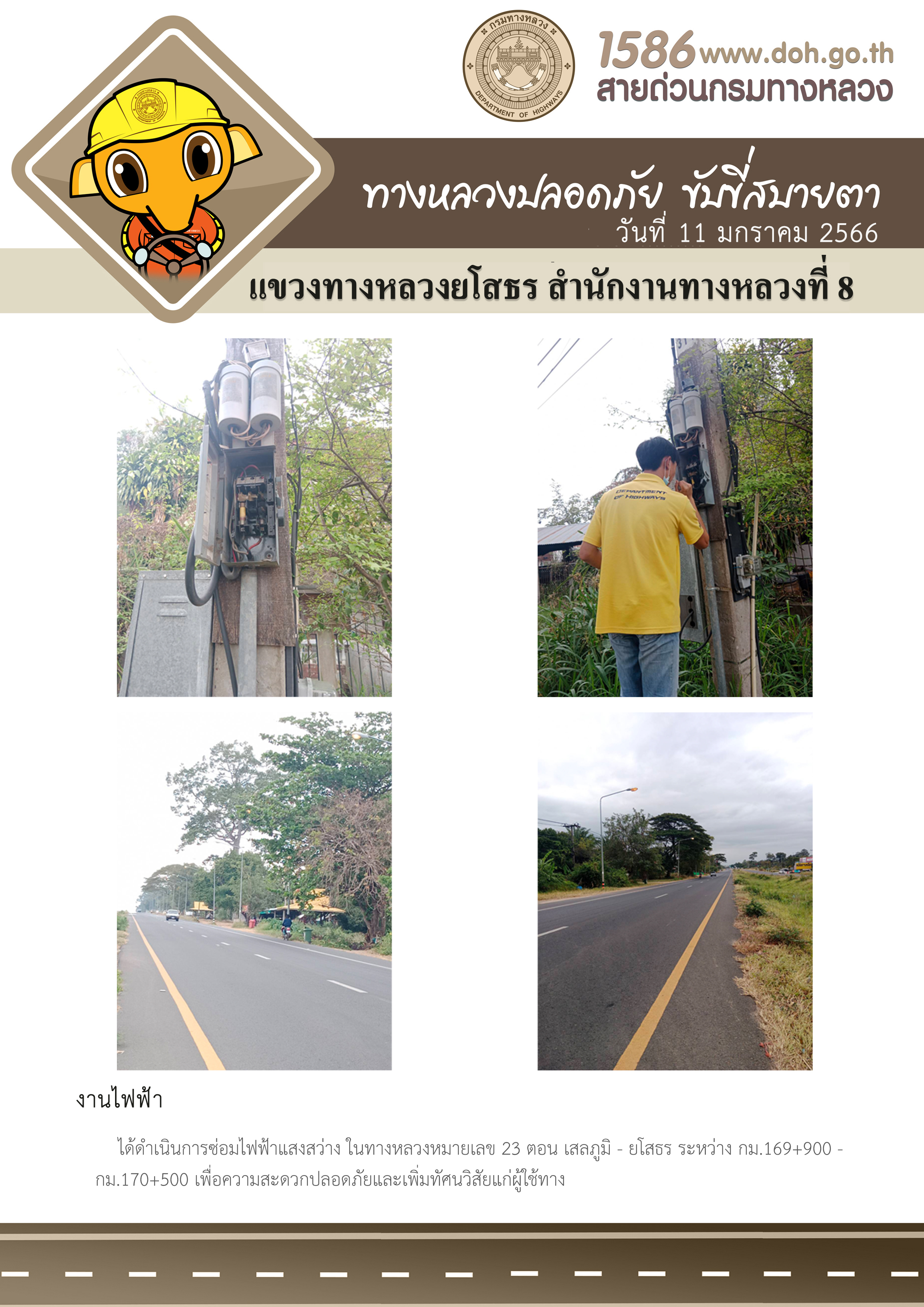 วันที่ 11 มกราคม 2566 งานไฟฟ้า ได้ดำเนินการซ่อมไฟฟ้าแสงสว่าง ในทางหลวงหมายเลข 23 ตอน เสลภูมิ - ยโสธร ระหว่าง กม.169+900 - กม.170+500 เพื่อความสะดวกปลอดภัยและเพิ่มทัศนวิสัยแก่ผู้ใช้ทาง