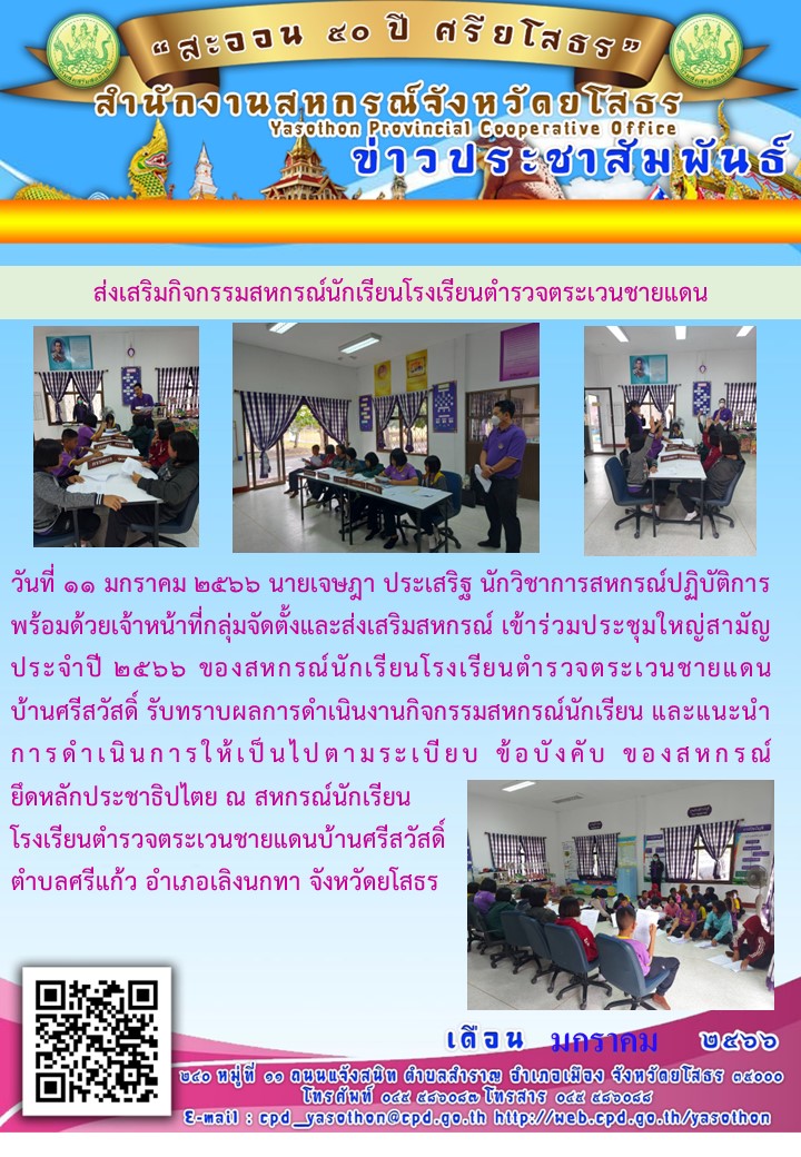 เจ้าหน้าที่สำนักงานสหกรณ์จังหวัดยโสธร เข้าร่วมประชุมใหญ่สามัญประจำปี 2566 ณ สหกรณ์นักเรียนโรงเรียนตำรวจตระเวนชายแดนบ้านศรีสวัสดิ์ ตำบลศรีแก้ว อำเภอเลิงนกทา จังหวัดยโสธร