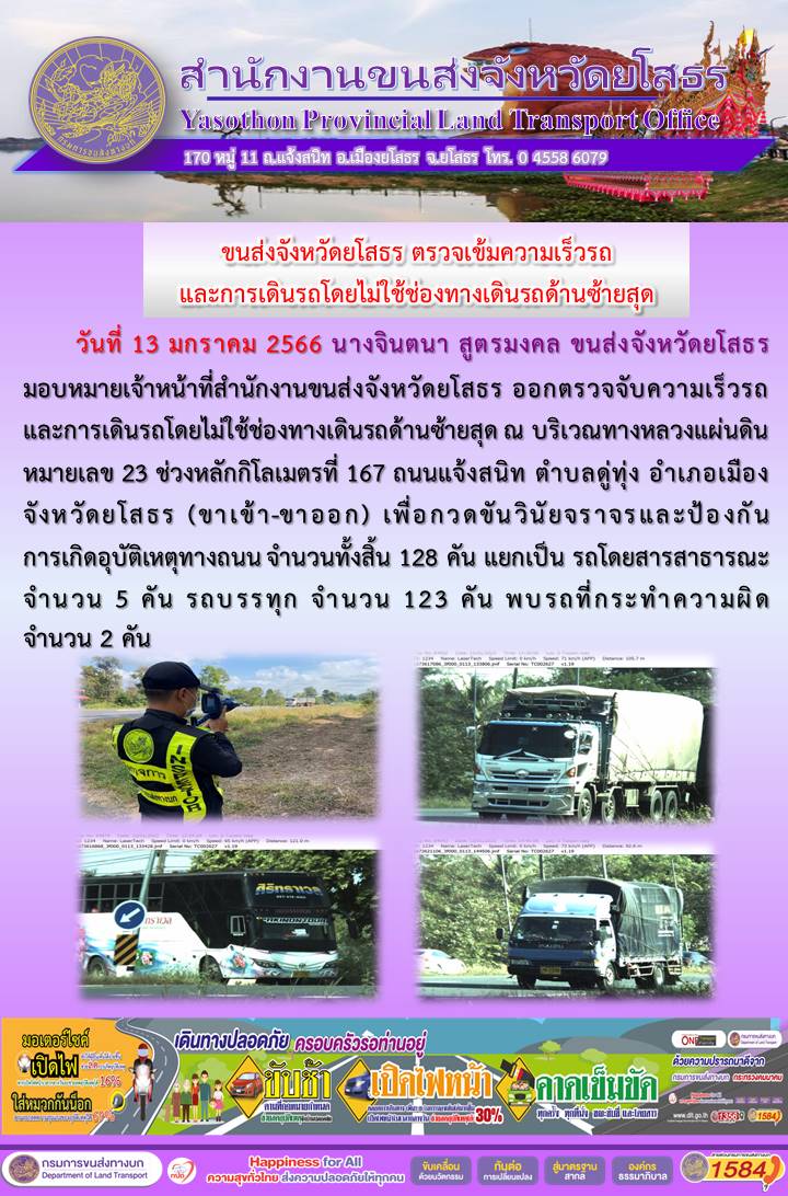 วันที่ 13 มกราคม 2566 เจ้าหน้าที่สำนักงานขนส่งจังหวัดยโสธร ออกตั้งจุดตรวจจับความเร็ว