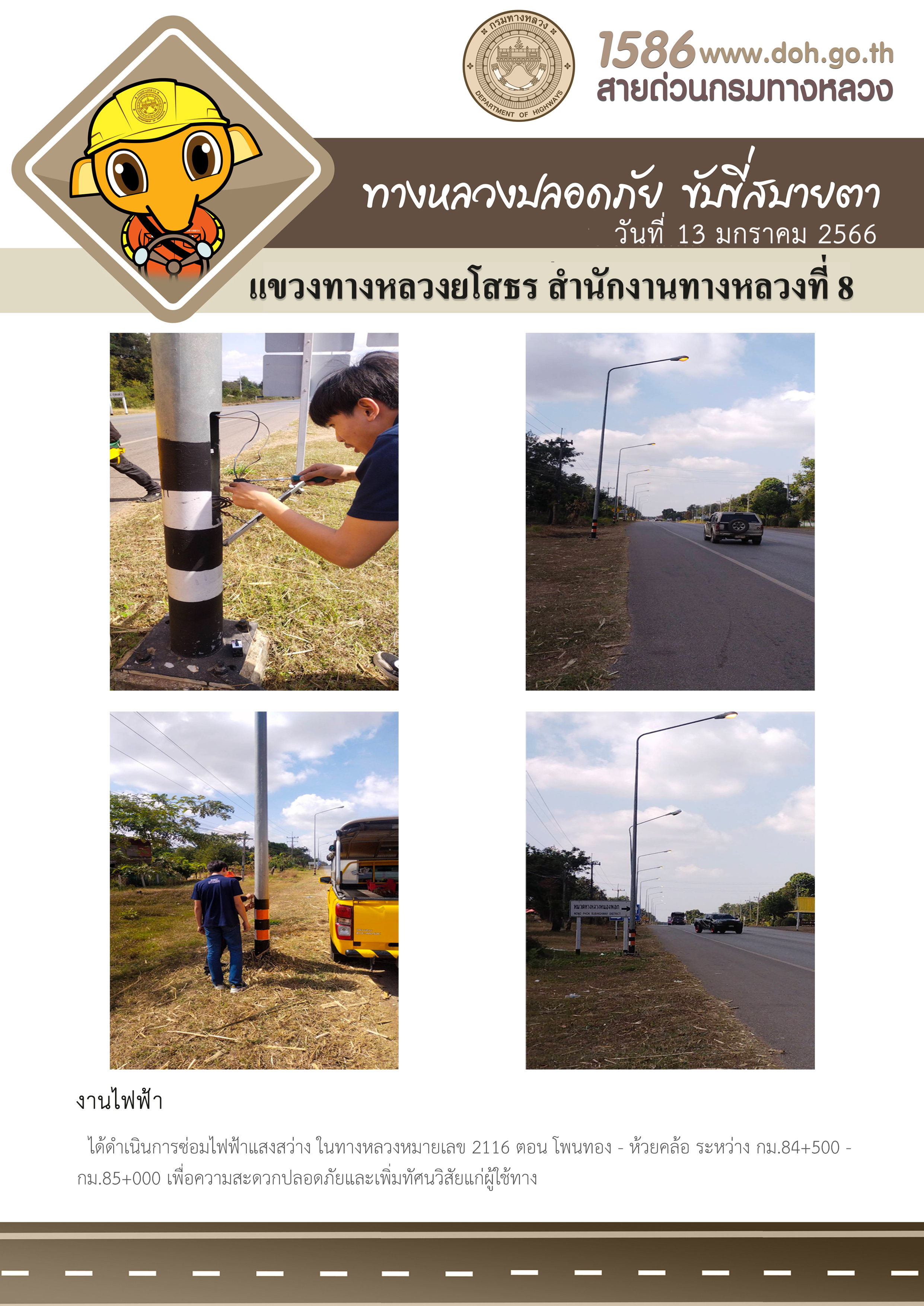 วันที่ 13 มกราคม 2566 งานไฟฟ้า ได้ดำเนินการซ่อมไฟฟ้าแสงสว่าง ในทางหลวงหมายเลข 2116 ตอน โพนทอง - ห้วยคล้อ ระหว่าง กม.84+500 - กม.85+000 เพื่อความสะดวกปลอดภัยและเพิ่มทัศนวิสัยแก่ผู้ใช้ทาง