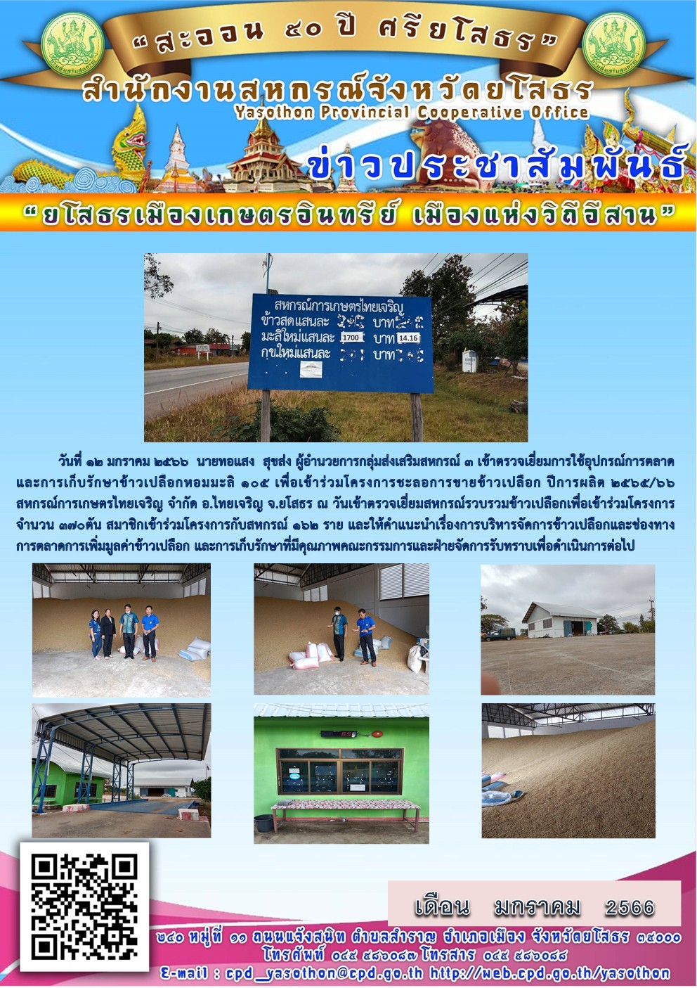 เจ้าหน้าที่สำนักงานสหกรณ์จังหวัดยโสธร เข้าตรวจเยี่ยมการใช้อุปกรณ์การตลาดและการเก็บรักษาข้าวเปลือกหอมมะลิ 105 เพื่อเข้าร่วมโครงการชะลอการขายข้าวเปลือก ปีการผลิต 2565/66 สหกรณ์การเกษตรไทยเจริญ จำกัด อ.ไทยเจริญ จ.ยโสธร