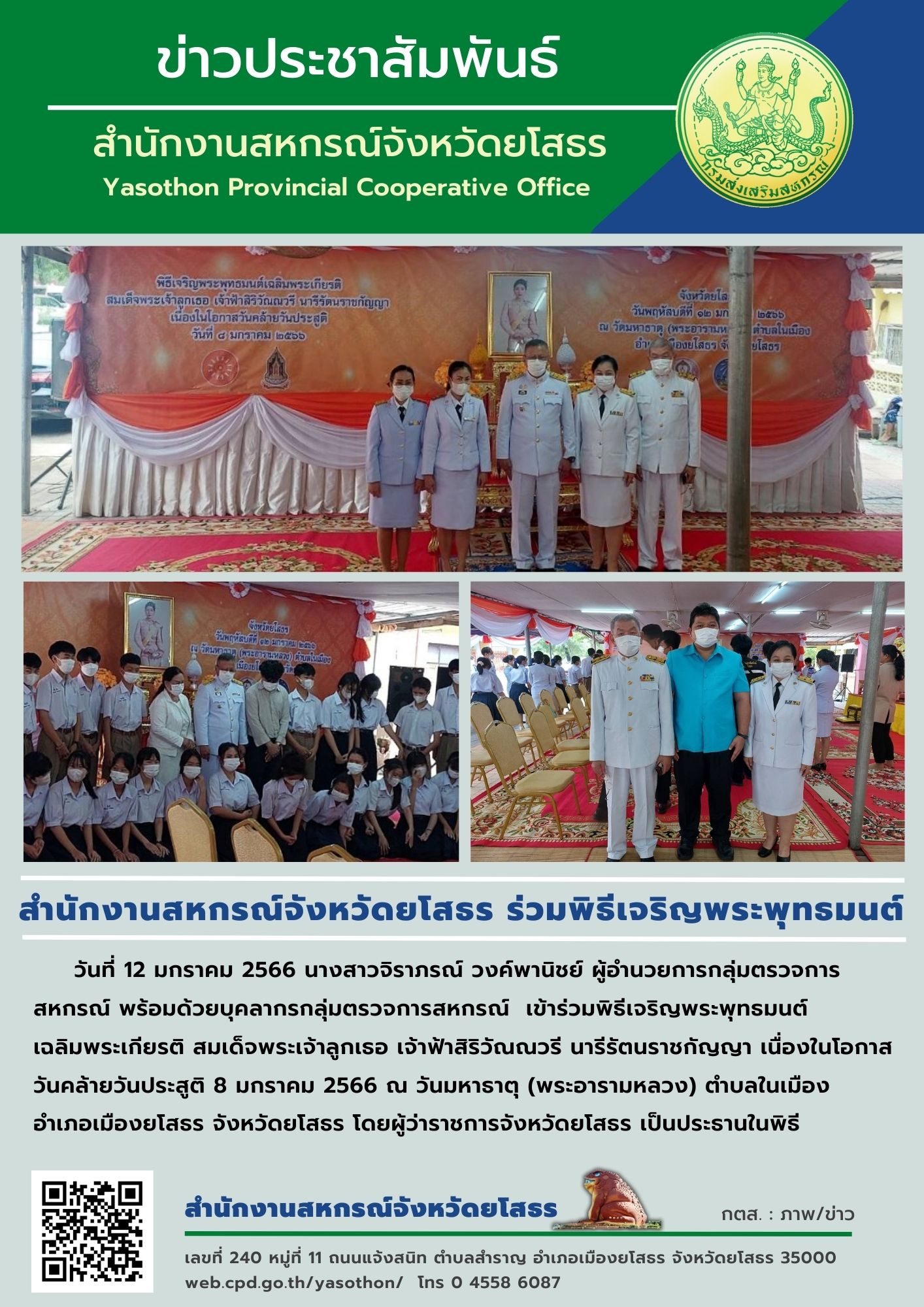 เจ้าหน้าที่สำนักงานสหกรณ์จังหวัดยโสธร เข้าร่วมพิธีเจริญพระพุทธมนต์เฉลิมพระเกียรติ สมเด็จพระเจ้าลูกเธอ เจ้าฟ้าสิริวัณณวรี นารีรัตนราชกัญญา เนื่องในโอกาสวันคล้ายวันประสูติ 8 มกราคม 2566 ณ วันมหาธาตุ (พระอารามหลวง) ตำบลในเมือง อำเภอเมืองยโสธร