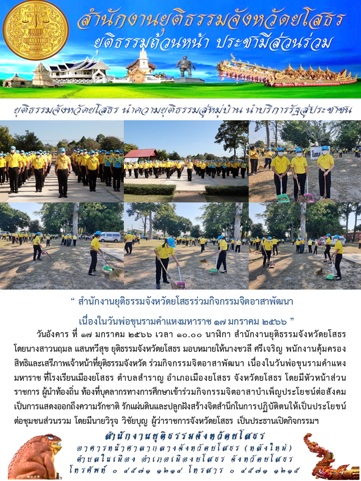 สำนักงานยุติธรรมจังหวัดยโสธรร่วมกิจกรรมจิตอาสาพัฒนา เนื่องในวันพ่อขุนรามคำแหงมหาราช 17 มกราคม 2566
