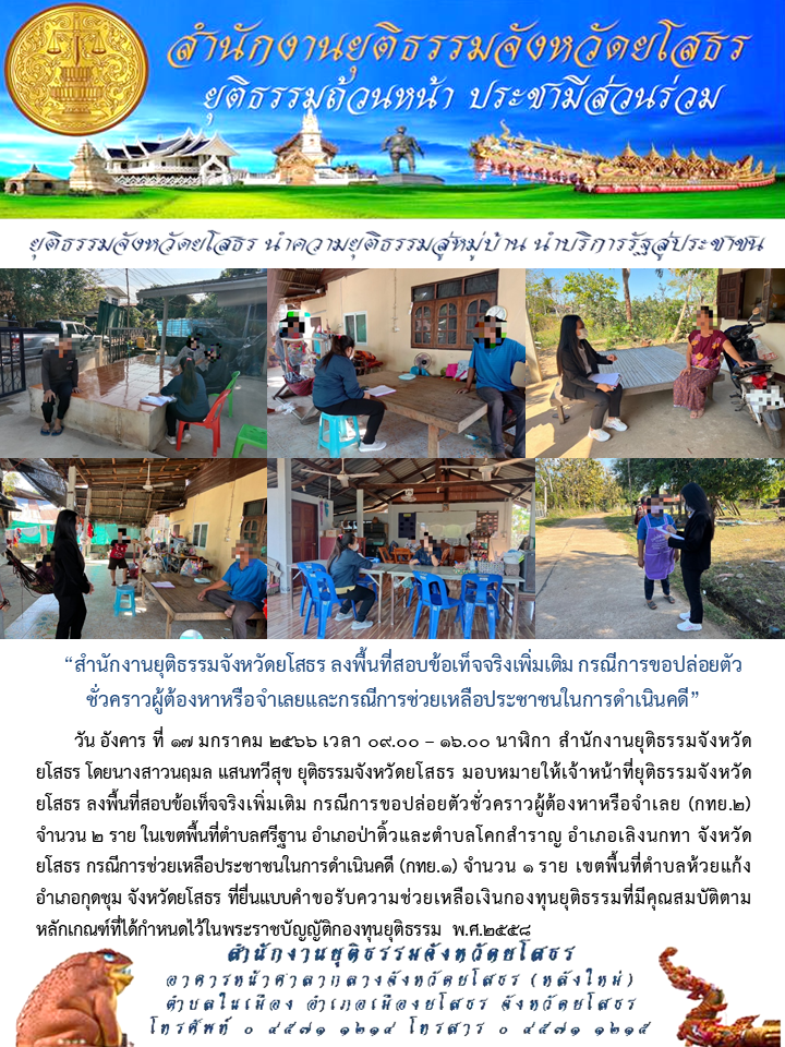 สำนักงานยุติธรรมจังหวัดยโสธร ลงพื้นที่สอบข้อเท็จจริงเพิ่มเติม กรณีการขอปล่อยตัวชั่วคราวผู้ต้องหาหรือจำเลยและกรณีการช่วยเหลือประชาชนในการดำเนินคดี