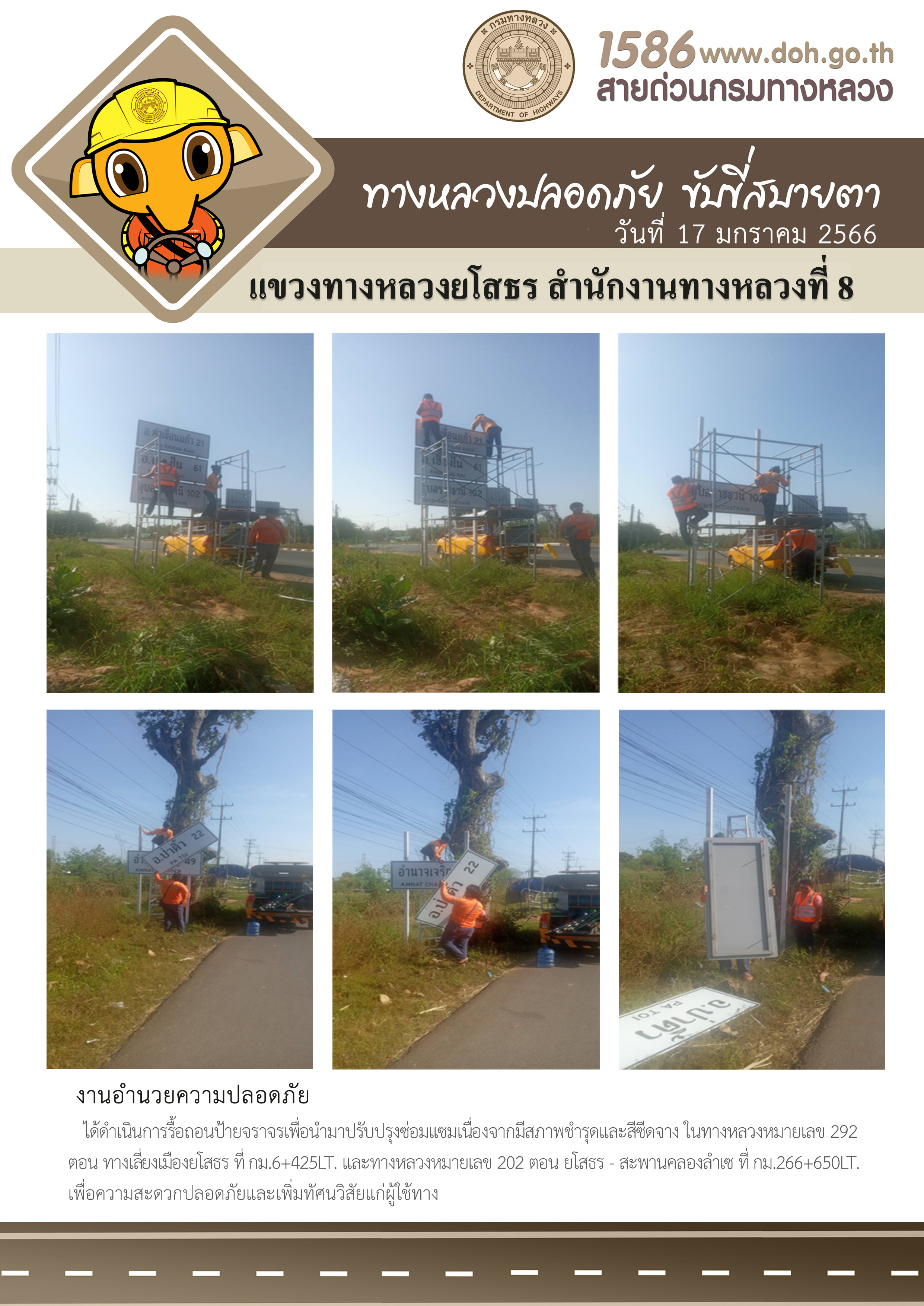 วันที่ 17 มกราคม 2566 งานอำนวยความปลอดภัย ได้ดำเนินการรื้อถอนป้ายจราจรเพื่อนำมาปรับปรุงซ่อมแซม เนื่องจากมีสภาพชำรุดและสีซีดจาง ในทล.292 ตอนทางเลี่ยงเมืองยโสธร ที่กม.6+425LT. และทล.202 ตอนยโสธร-สะพานคลองลำเซ ที่กม.266+650LT. เพื่อความสะดวกปลอดภัย