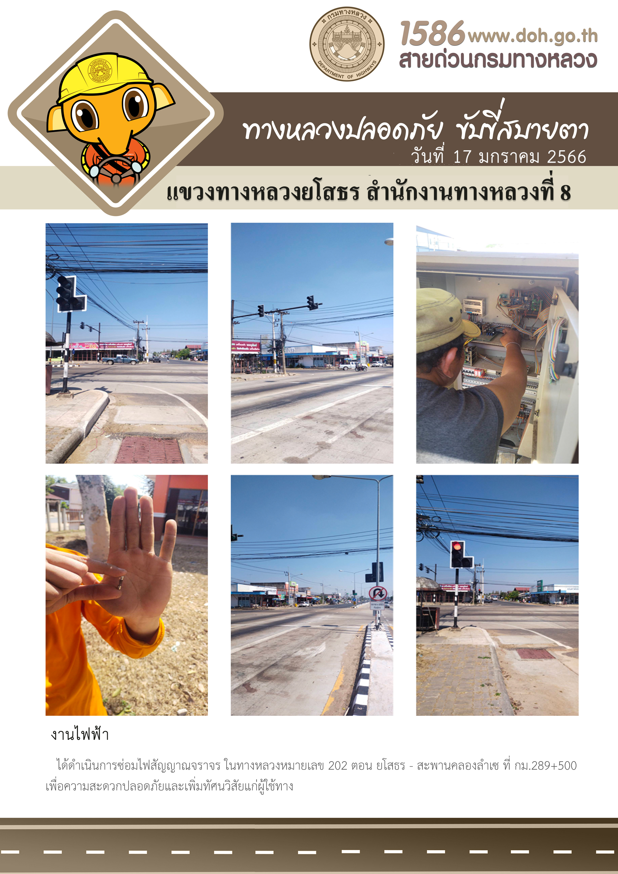 วันที่ 17 มกราคม 2566 งานไฟฟ้า ได้ดำเนินการซ่อมไฟสัญญาณจราจร ในทางหลวงหมายเลข 202 ตอน ยโสธร - สะพานคลองลำเซ ที่ กม.289+500 เพื่อความสะดวกปลอดภัยและเพิ่มทัศนวิสัยแก่ผู้ใช้ทาง