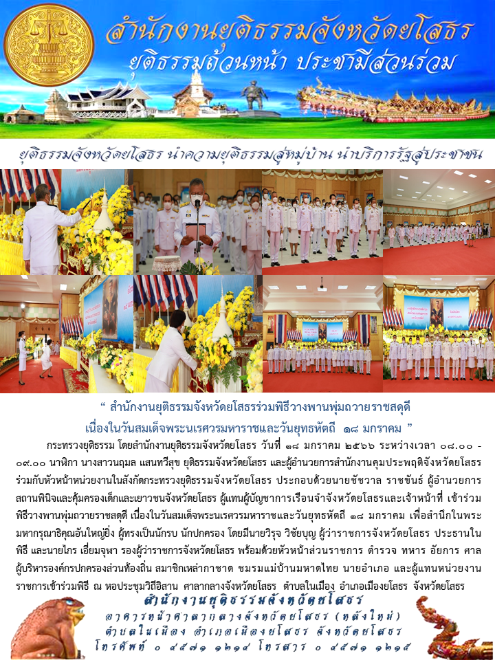 วันที่ 18 ม.ค. 2566 (13:07 น.)กระทรวงยุติธรรม โดยสำนักงานยุติธรรมจังหวัดยโสธร วันที่ 18 มกราคม 2566 ระหว่างเวลา 08.00 - 09.00 นาฬิกา นางสาวนฤมล แสนทวีสุข ยุติธรรมจังหวัดยโสธร และผู้อำนวยการสำนักงานคุมประพฤติจังหวัดยโสธร ร่วมกับหัวหน้าหน่วยงานในสังกัดกระทรวงยุติธรรมจังหวัดยโสธร ประกอบด้วยนายชัชวาล ราชขันธ์ ผู้อำนวยการสถานพินิจและคุ้มครองเด็กและเยาวชนจังหวัดยโสธร ผู้แทนผู้บัญชาการเรือนจำจังหวัดยโสธรและเจ้าหน้าที่ เข้าร่วมพิธีวางพานพุ่มถวายราชสดุดี เนื่องในวันสมเด็จพระนเรศวรมหาราชและวันยุทธหัตถี 18 มกราคม เพื่อสำนึกในพระมหากรุณาธิคุณอันใหญ่ยิ่ง ผู้ทรงเป็นนักรบ นักปกครอง โดยมีนายวิรุจ วิชัยบุญ ผู้ว่าราชการจังหวัดยโสธร ประธานในพิธี และนายไกร เอี่ยมจุฬา รองผู้ว่าราชการจังหวัดยโสธร พร้อมด้วยหัวหน้าส่วนราชการ ตำรวจ ทหาร อัยการ ศาล ผู้บริหารองค์กรปกครองส่วนท้องถิ่น สมาชิกเหล่ากาชาด ชมรมแม่บ้านมหาดไทย นายอำเภอ และผู้แทนหน่วยงานราชการเข้าร่วมพิธี ณ หอประชุมวิถีอิสาน ศาลากลางจังหวัดยโสธร ตำบลในเมือง อำเภอเมืองยโสธร จังหวัดยโสธร