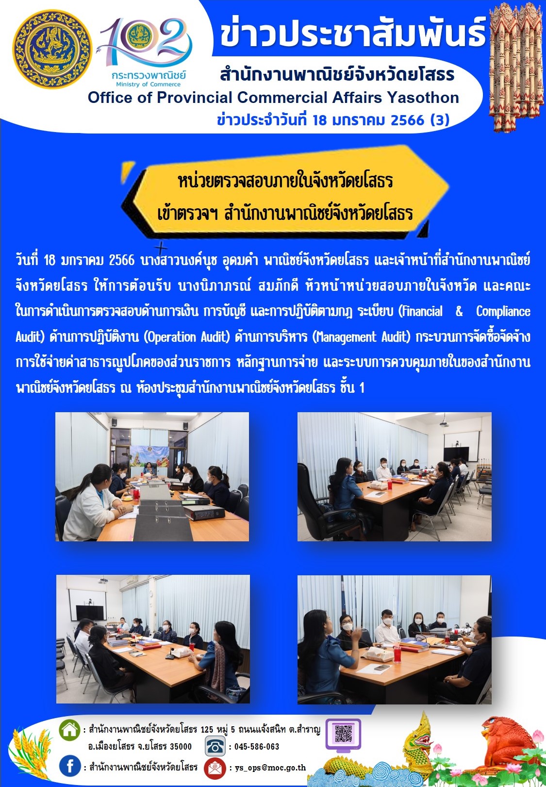 ในการดำเนินการตรวจสอบด้านการเงิน การบัญชี และการปฏิบัติตามกฎ ระเบียบ (Financial & Compliance Audit) ด้านการปฏิบัติงาน (Operation Audit) ด้านการบริหาร (Management Audit) กระบวนการจัดซื้อจัดจ้าง การใช้จ่ายค่าสาธารณูปโภคของส่วนราชการ หลักฐานการจ่าย และระบบการควบคุมภายในของสำนักงานพาณิชย์จังหวัดยโสธร ณ ห้องประชุมสำนักงานพาณิชย์จังหวัดยโสธร ชั้น 1