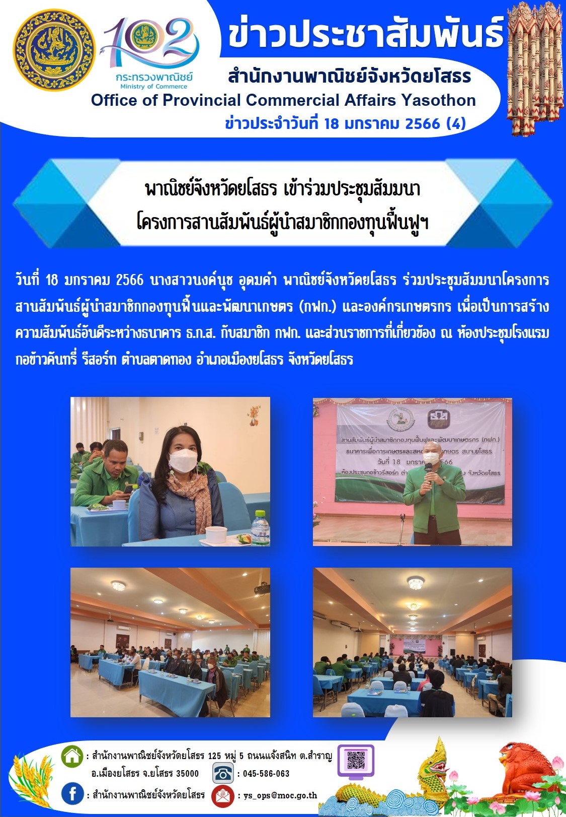 วันที่ 18 ม.ค. 2566 (17:29 น.)วันที่ 18 มกราคม 2566 นางสาวนงค์นุช อุดมคำ พาณิชย์จังหวัดยโสธร ร่วมประชุมสัมมนาโครงการ