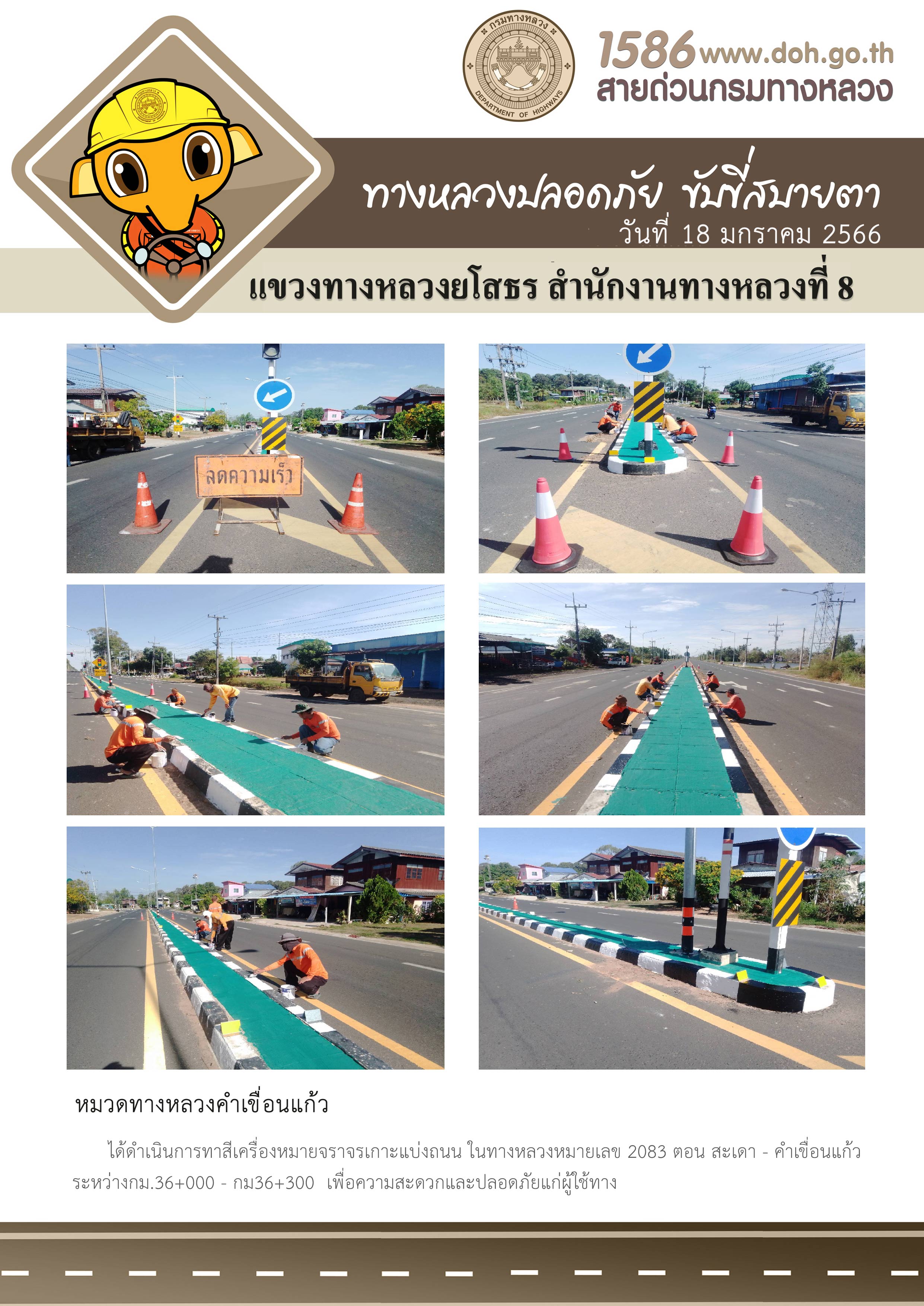 วันที่ 18 มกราคม 2566 หมวดทางหลวงคำเขื่อนแก้ว ได้ดำเนินการทาสีเครื่องหมายจราจรเกาะแบ่งถนน ในทางหลวงหมายเลข 2083 ตอน สะเดา - คำเขื่อนแก้ว ระหว่างกม.36+000 - กม36+300 เพื่อความสะดวกและปลอดภัยแก่ผู้ใช้ทาง