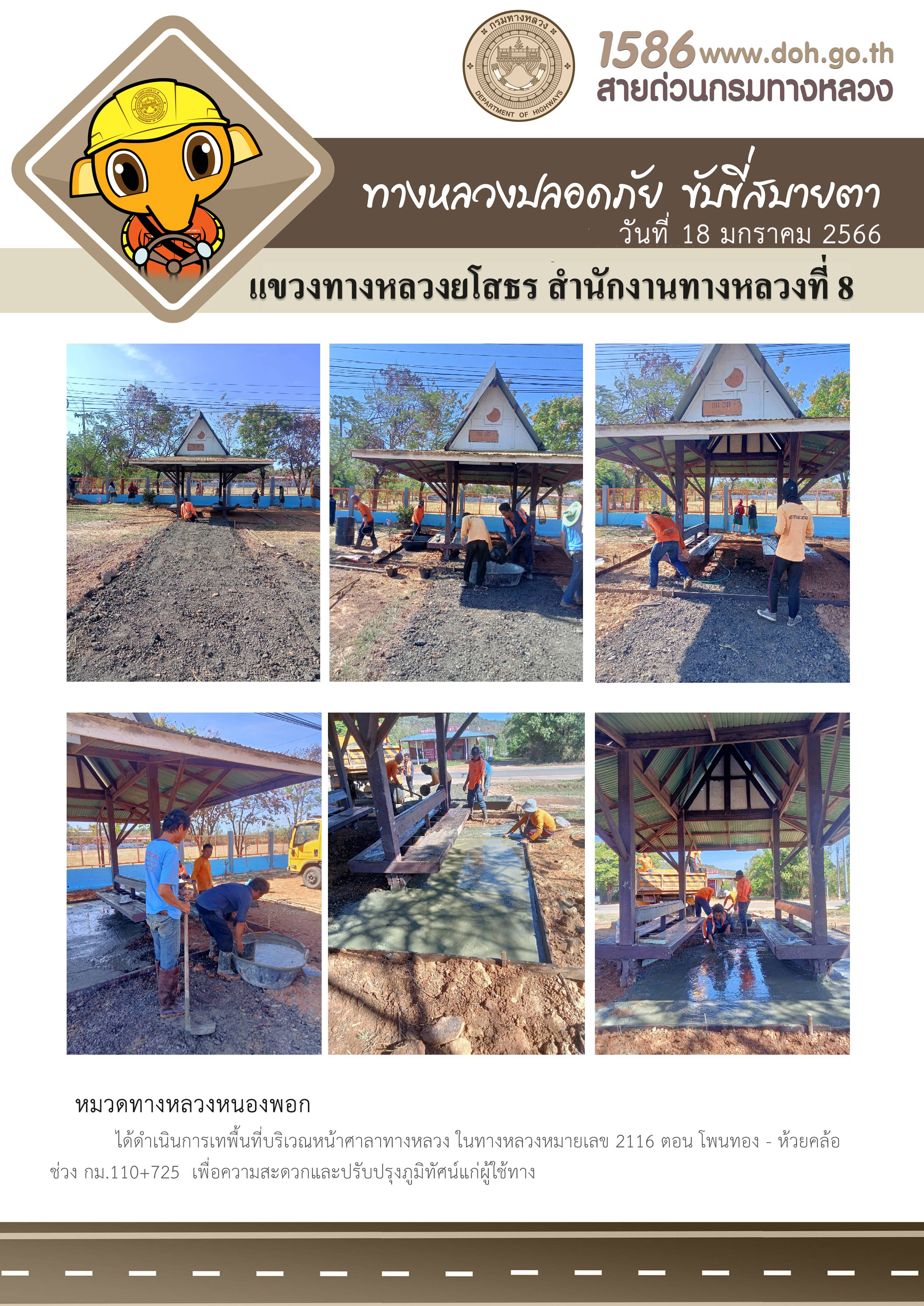 วันที่ 18 มกราคม 2566 หมวดทางหลวงหนองพอก ได้ดำเนินการเทพื้น ที่บริเวณหน้าศาลาทางหลวง ในทางหลวงหมายเลข 2116 ตอน โพนทอง - ห้วยคล้อ ช่วง กม.110+725 เพื่อความสะดวกและปรับปรุงภูมิทัศน์แก่ผู้ใช้ทาง