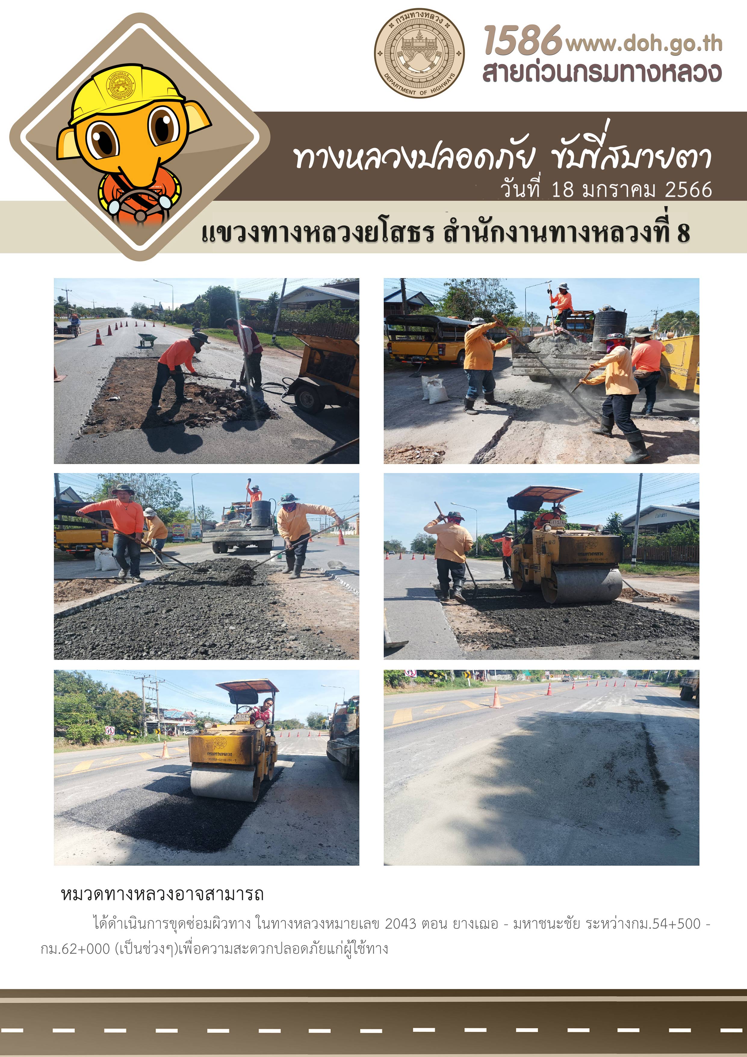 วันที่ 18 มกราคม 2566 หมวดทางหลวงอาจสามารถ ได้ดำเนินการขุดซ่อมผิวทาง ในทางหลวงหมายเลข 2043 ตอน ยางเฌอ - มหาชนะชัย ระหว่าง กม.54+500 - กม.62+000 (เป็นช่วงๆ)เพื่อความสะดวกปลอดภัยแก่ผู้ใช้ทาง