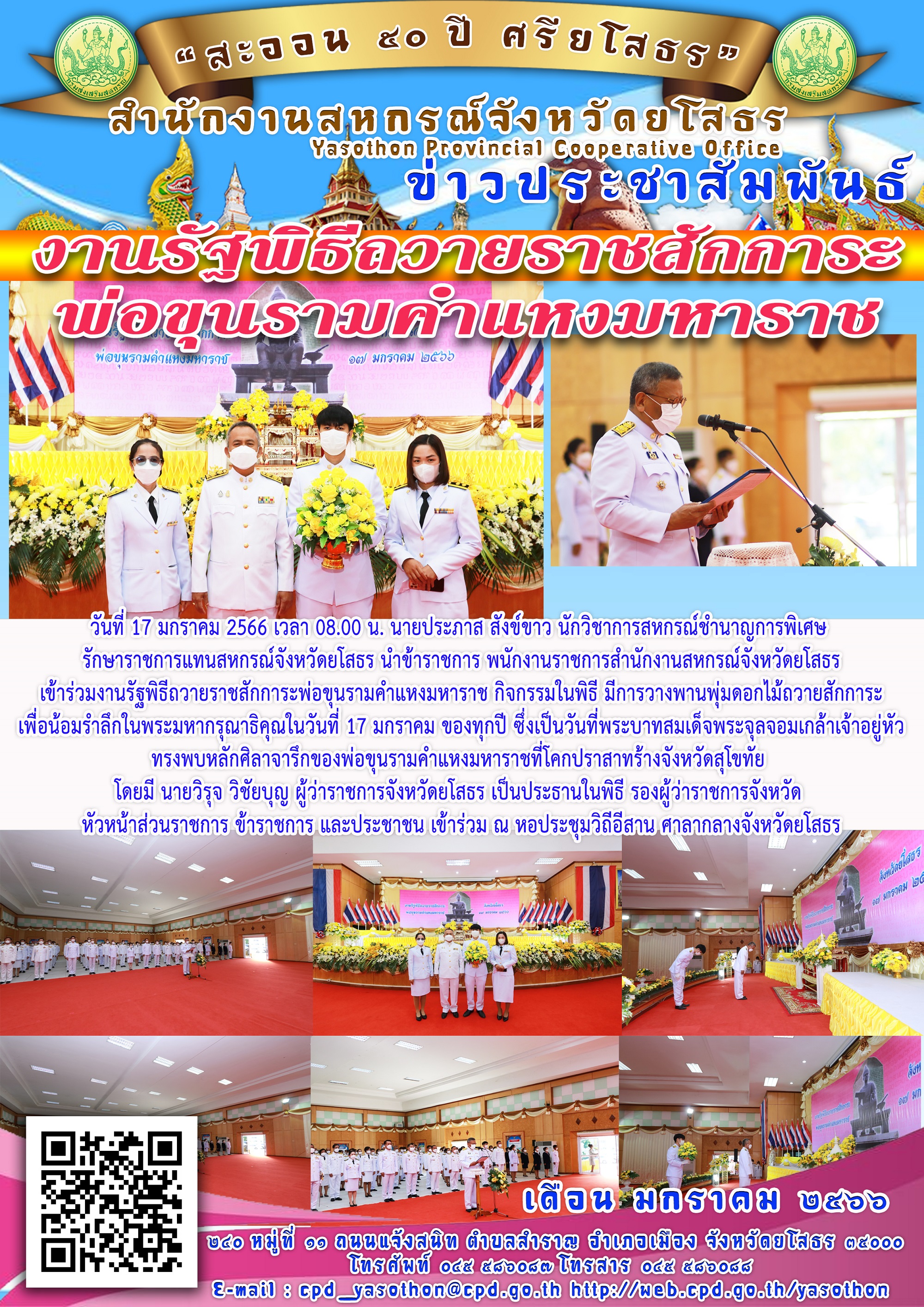 เจ้าหน้าที่สำนักงานสหกรณ์จังหวัดยโสธร เข้าร่วมงานรัฐพิธีถวายราชสักการะพ่อขุนรามคำแหงมหาราช กิจกรรมในพิธี มีการวางพานพุ่มดอกไม้ถวายสักการะ เพื่อน้อมรำลึกในพระมหากรุณาธิคุณในวันที่ 17 มกราคม ของทุกปี ณ หอประชุมวิถีอีสาน ศาลากลางจังหวัดยโสธร