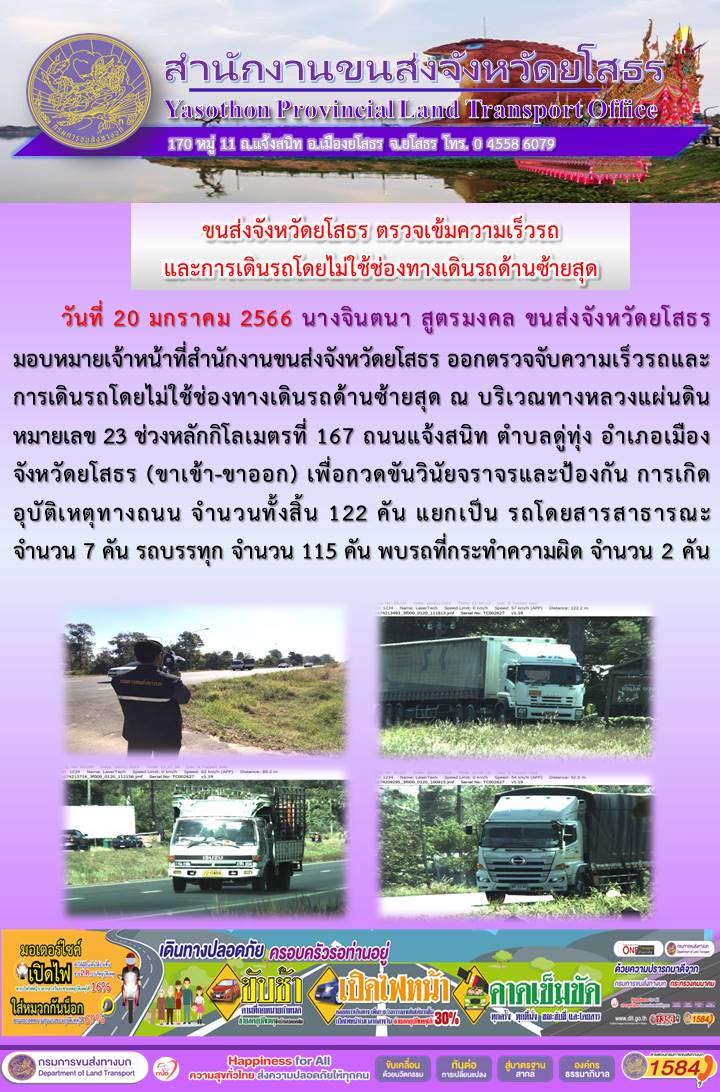 วันที่ 20 มกราคม 2566 เจ้าหน้าที่สำนักงานขนส่งจังหวัดยโสธร ออกตั้งจุดตรวจจับความเร็ว