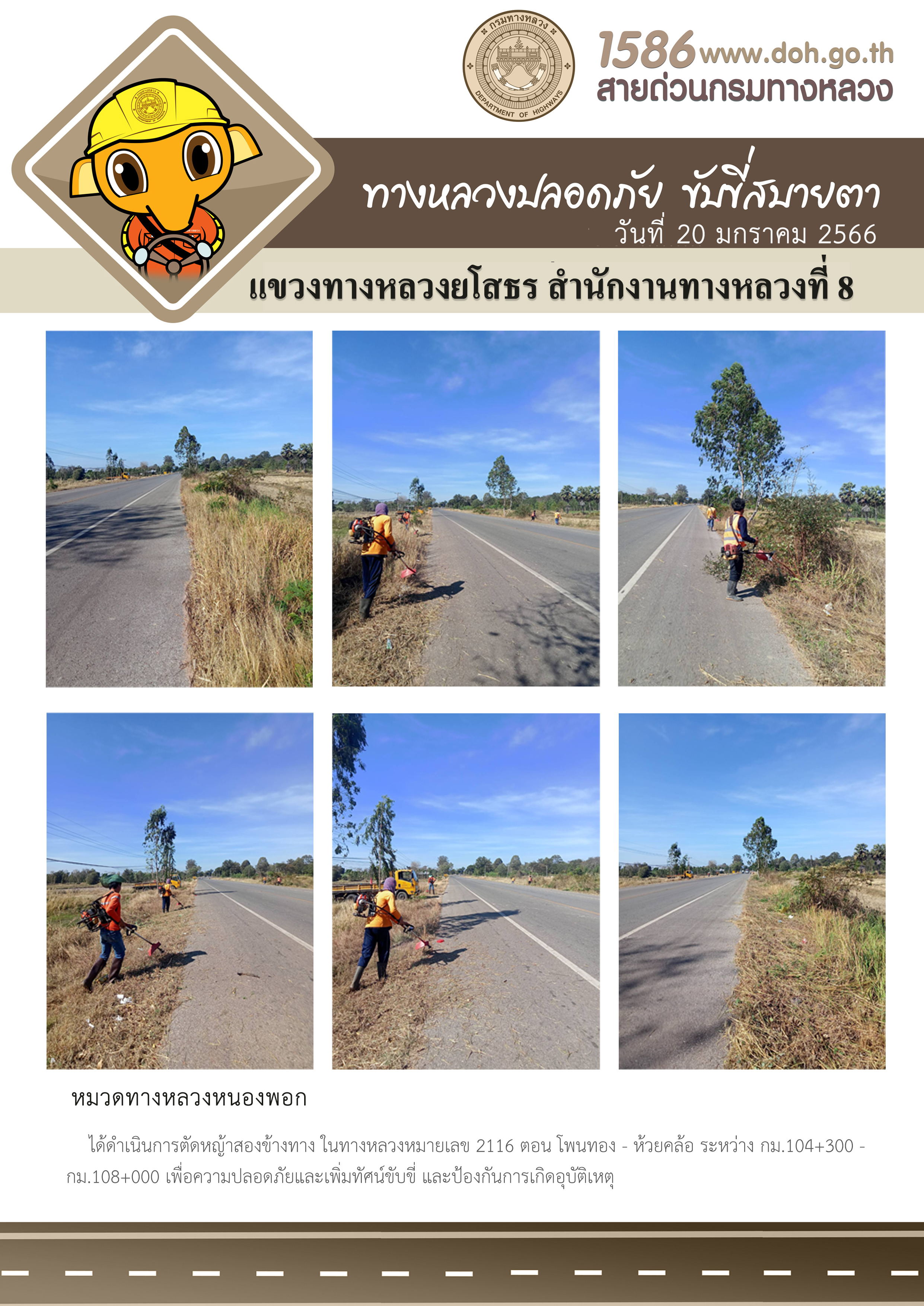 วันที่ 20 มกราคม 2566 หมวดทางหลวงหนองพอก ได้ดำเนินการตัดหญ้าสองข้างทาง ในทางหลวงหมายเลข 2116 ตอน โพนทอง - ห้วยคล้อ ระหว่าง กม.104+300 - กม.108+000 เพื่อความปลอดภัยและเพิ่มทัศนวิสัยในการขับขี่ และป้องกันการเกิดอุบัติเหตุ
