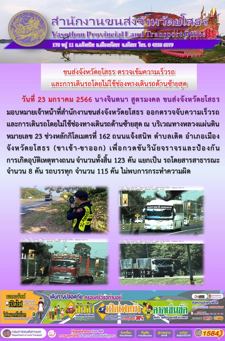 วันที่ 23 มกราคม 2566 เจ้าหน้าที่สำนักงานขนส่งจังหวัดยโสธร ออกตั้งจุดตรวจจับความเร็ว