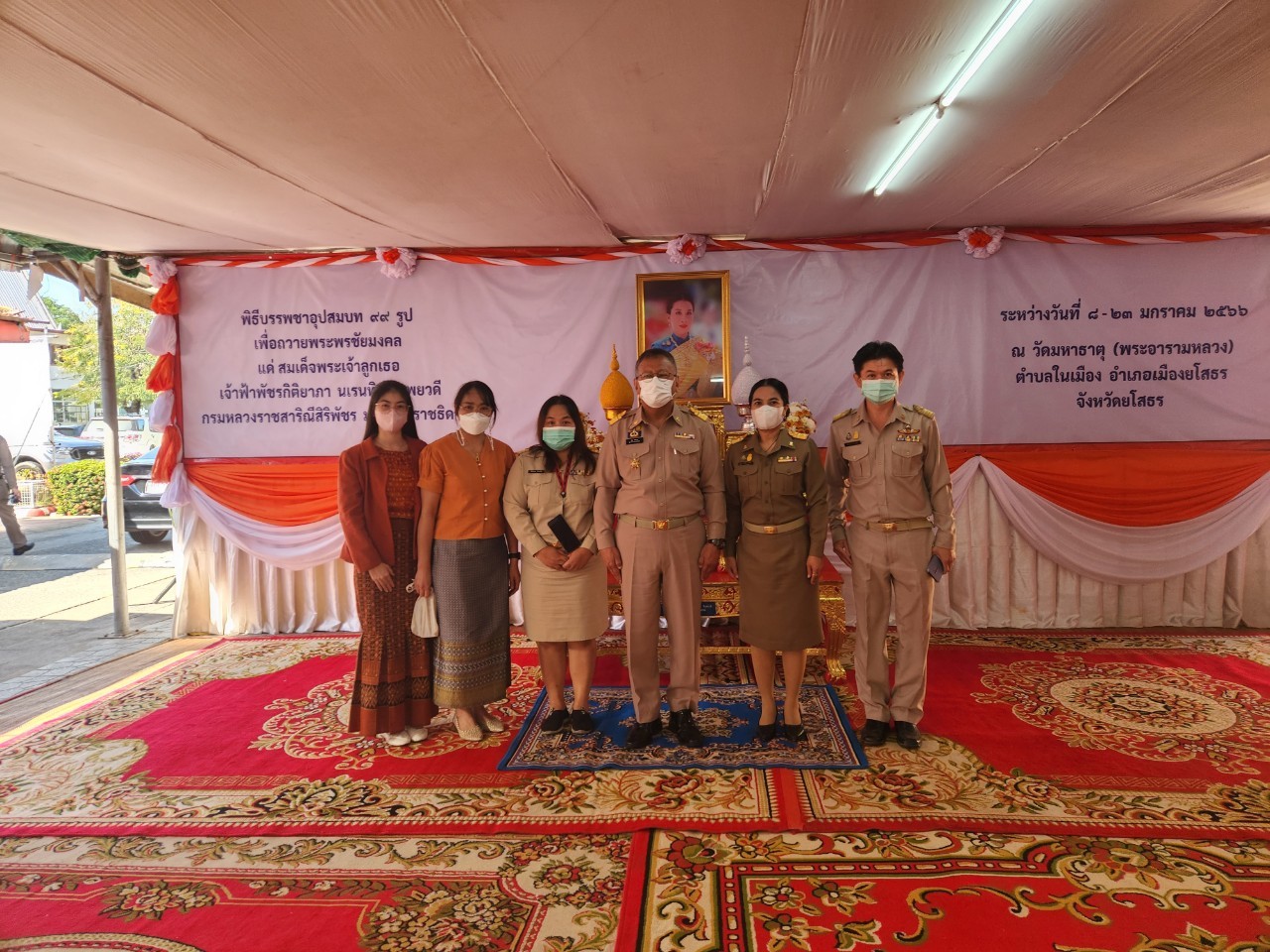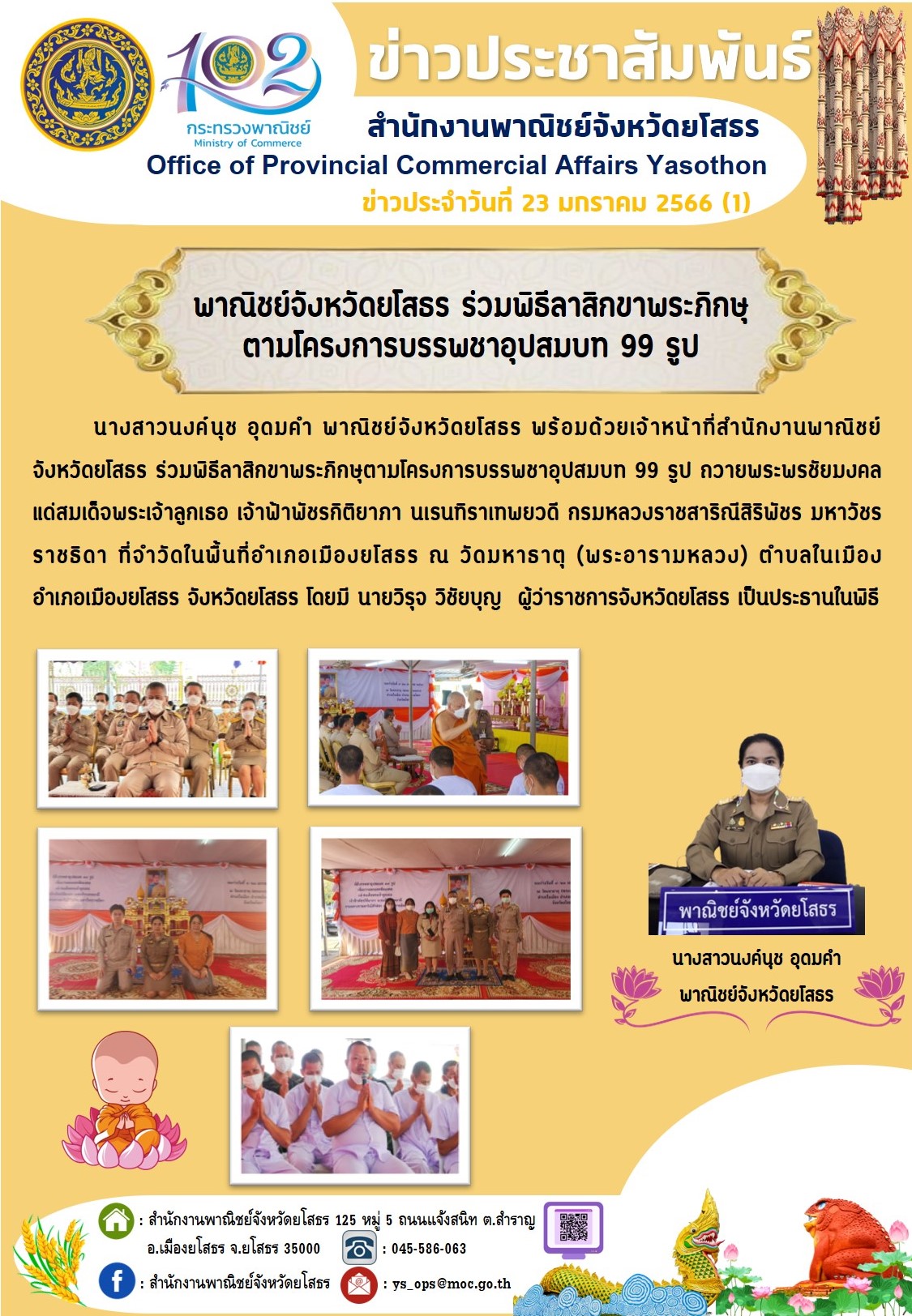 วันที่ 23 ม.ค. 2566 (14:45 น.)นางสาวนงค์นุช อุดมคำ พาณิชย์จังหวัดยโสธร พร้อมด้วยเจ้าหน้าที่สำนักงานพาณิชย์จังหวัดยโสธร ร่วมพิธีลาสิกขาพระภิกษุตามโครงการบรรพชาอุปสมบท 99 รูป ถวายพระพรชัยมงคล