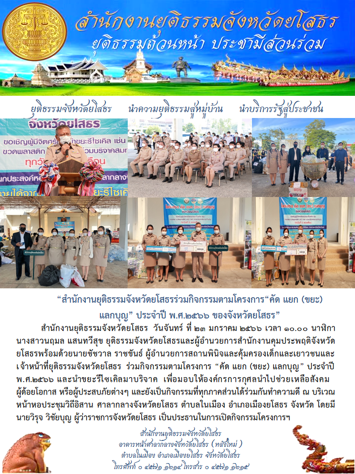 วันที่ 23 ม.ค. 2566 (21:00 น.)สำนักงานยุติธรรมจังหวัดยโสธร วันจันทร์ ที่ 23 มกราคม 2566 เวลา 10.00 นาฬิกา นางสาวนฤมล แสนทวีสุข ยุติธรรมจังหวัดยโสธรและผู้อำนวยการสำนักงานคุมประพฤติจังหวัดยโสธรพร้อมด้วยนายชัชวาล ราชขันธ์ ผู้อำนวยการสถานพินิจและคุ้มครองเด็กและเยาวชนและเจ้าหน้าที่ยุติธรรมจังหวัดยโสธร ร่วมกิจกรรมตามโครงการ “คัด แยก (ขยะ) แลกบุญ” ประจำปี พ.ศ.2566 และนำขยะรีไซเคิลมาบริจาค เพื่อมอบให้องค์กรการกุศลนำไปช่วยเหลือสังคม ผู้ด้อยโอกาส หรือผู้ประสบภัยต่างๆ และยังเป็นกิจกรรมที่ทุกภาคส่วนได้ร่วมกันทำความดี ณ บริเวณหน้าหอประชุมวิถีอิสาน ศาลากลางจังหวัดยโสธร ตำบลในเมือง อำเภอเมืองยโสธร จังหวัด โดยมี นายวิรุจ วิชัยบุญ ผู้ว่าราชการจังหวัดยโสธร เป็นประธานในการเปิดกิจกรรมโครงการฯ